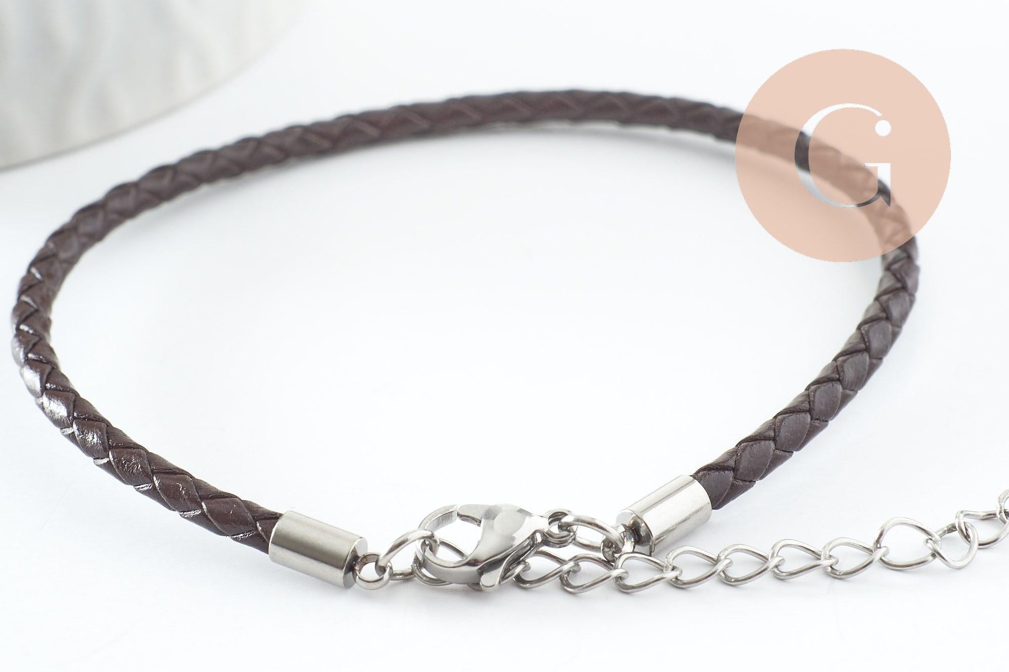 Bracelet réglable cuir cacao acier platine 304 inoxydable 3mm-21.5cm, bracelet unisexe acier inoxydable, x 1 (G9574)