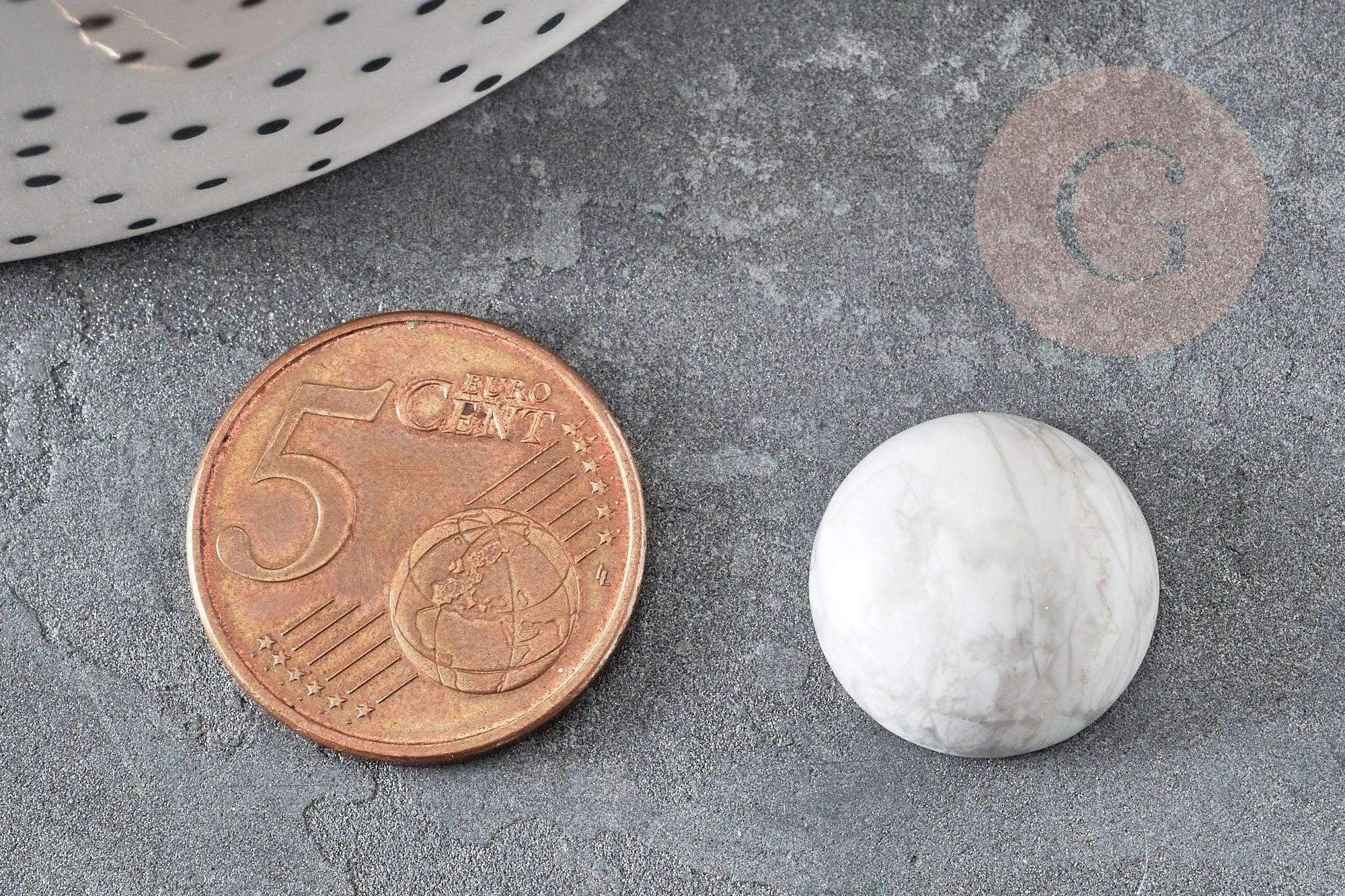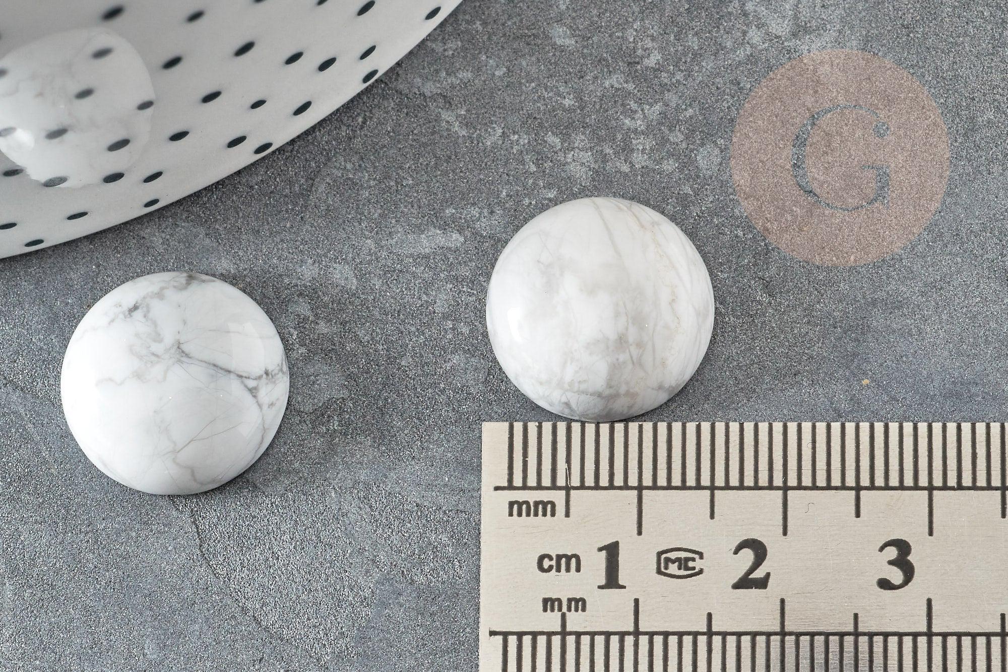Ce cabochon rond en howlite blanche naturelle, de 16 mm, présente une couleur blanche douce et lisse avec de fines veines grises qui lui confèrent un aspect unique et élégant.