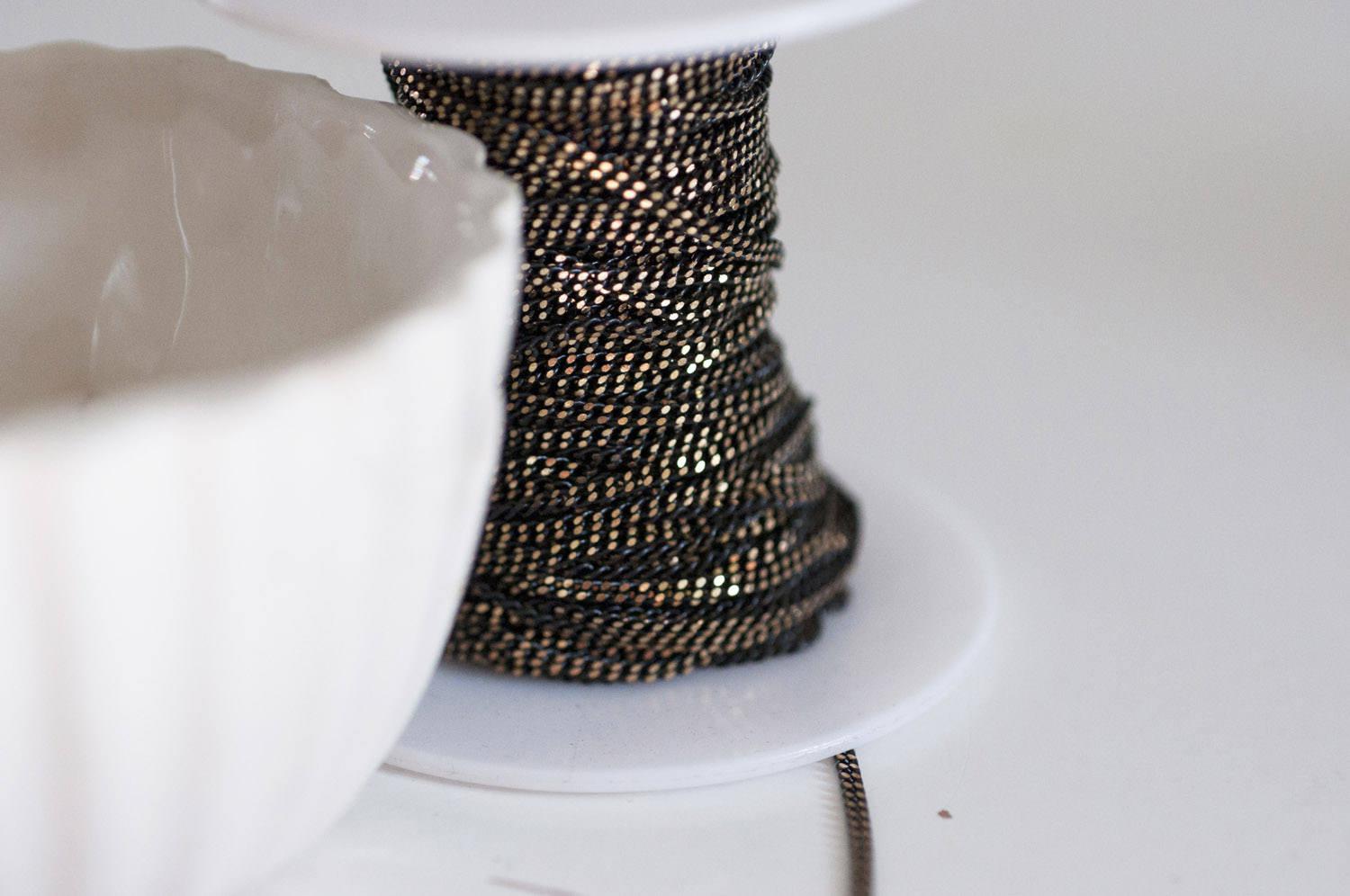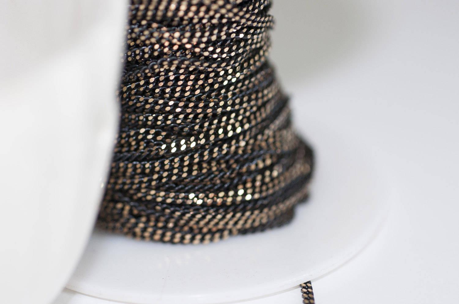 Chaine fine maille plate noire reflets dorés,chaine noire, fournitures créatives, chaine fine noire, création bijoux, 1.5mm,5 mètres Pour vos réalisations de bijoux fantaisie, voici une très fine chaine à mailles plates de couleur or antique ( avec noir) Maillons soudés...