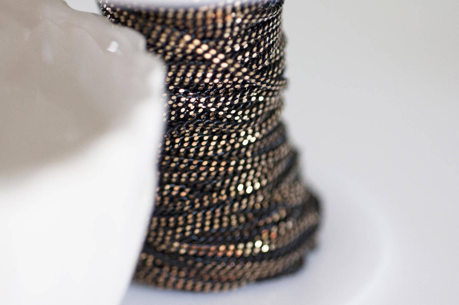 EP-Chaine fine maille plate noire reflets dorés 1.5mm, X 5 mètres G0554