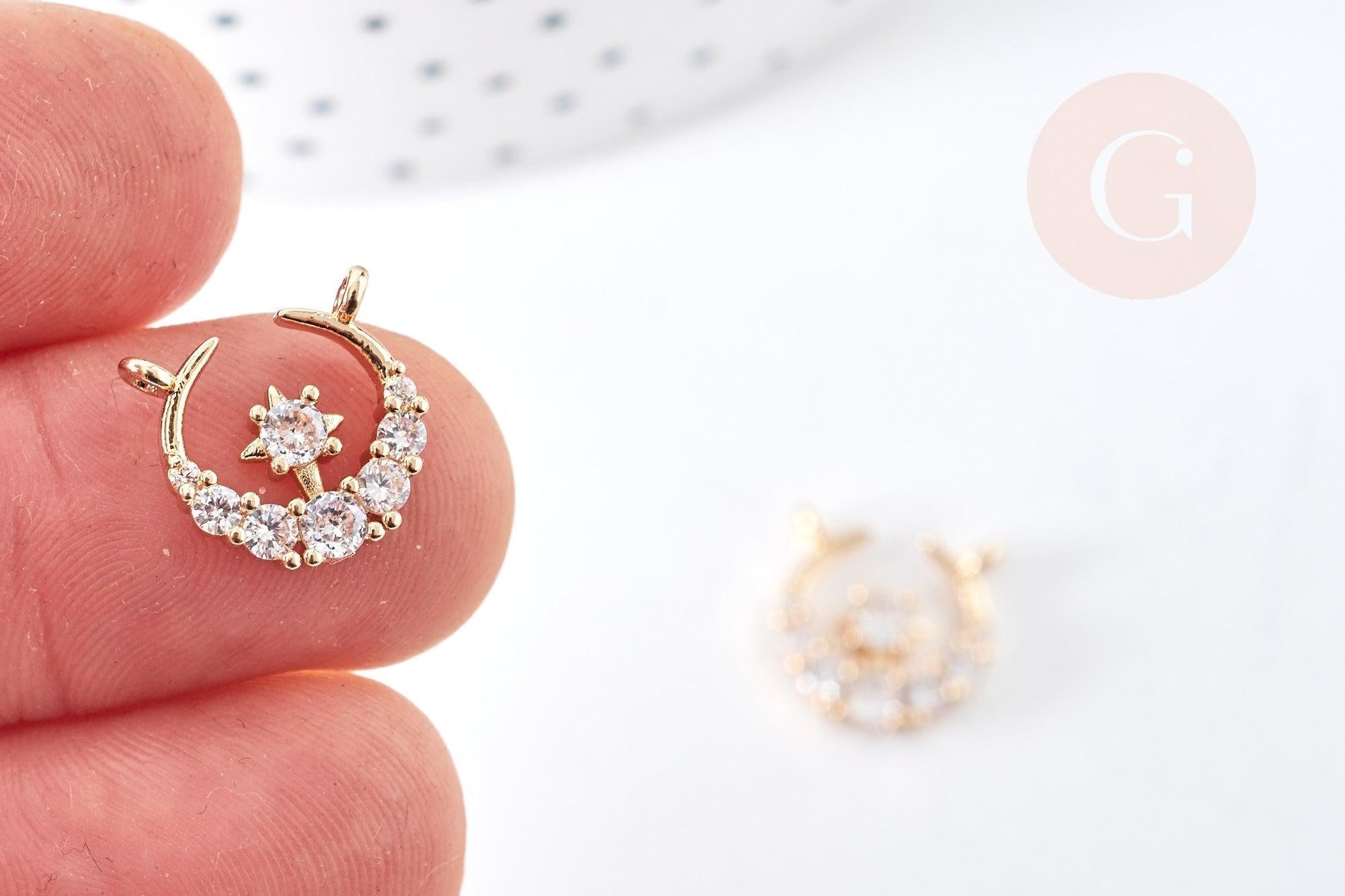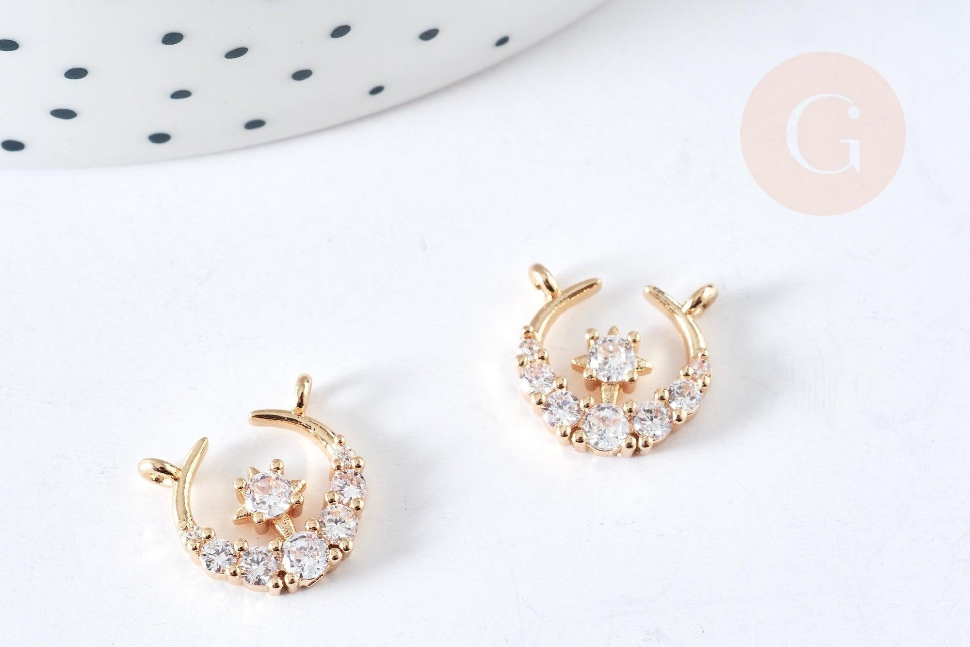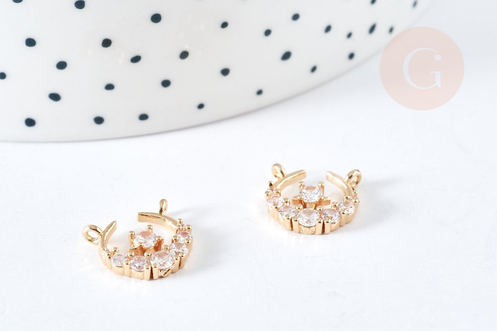 Ce ravissant pendentif connecteur en forme de croissant de lune est en laiton doré, serti de zircons blancs étincelants pour un look élégant et sophistiqué.