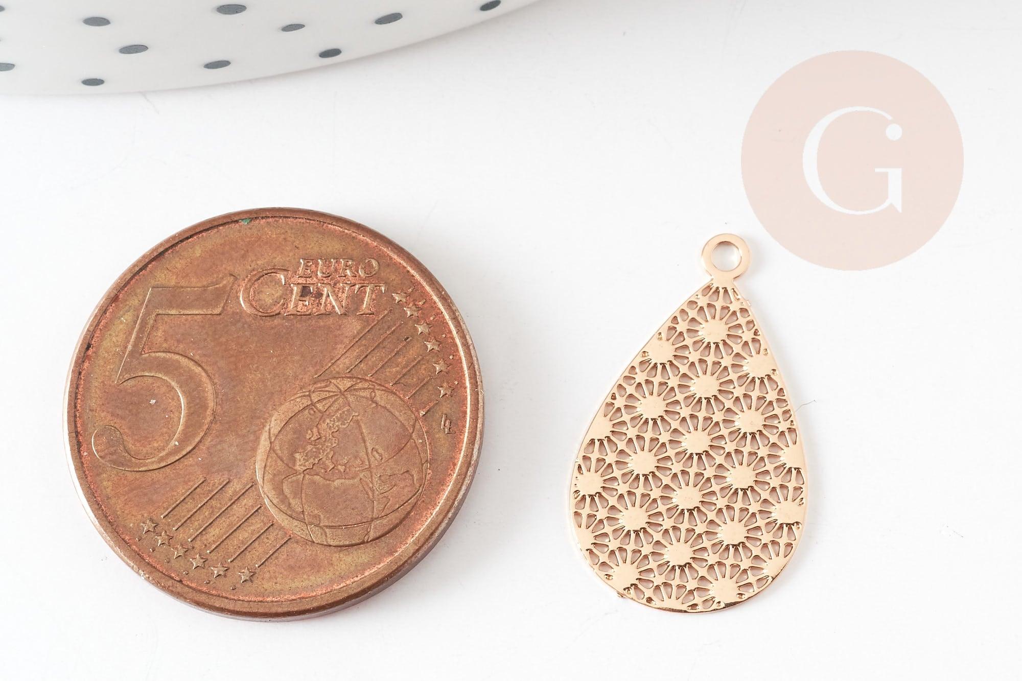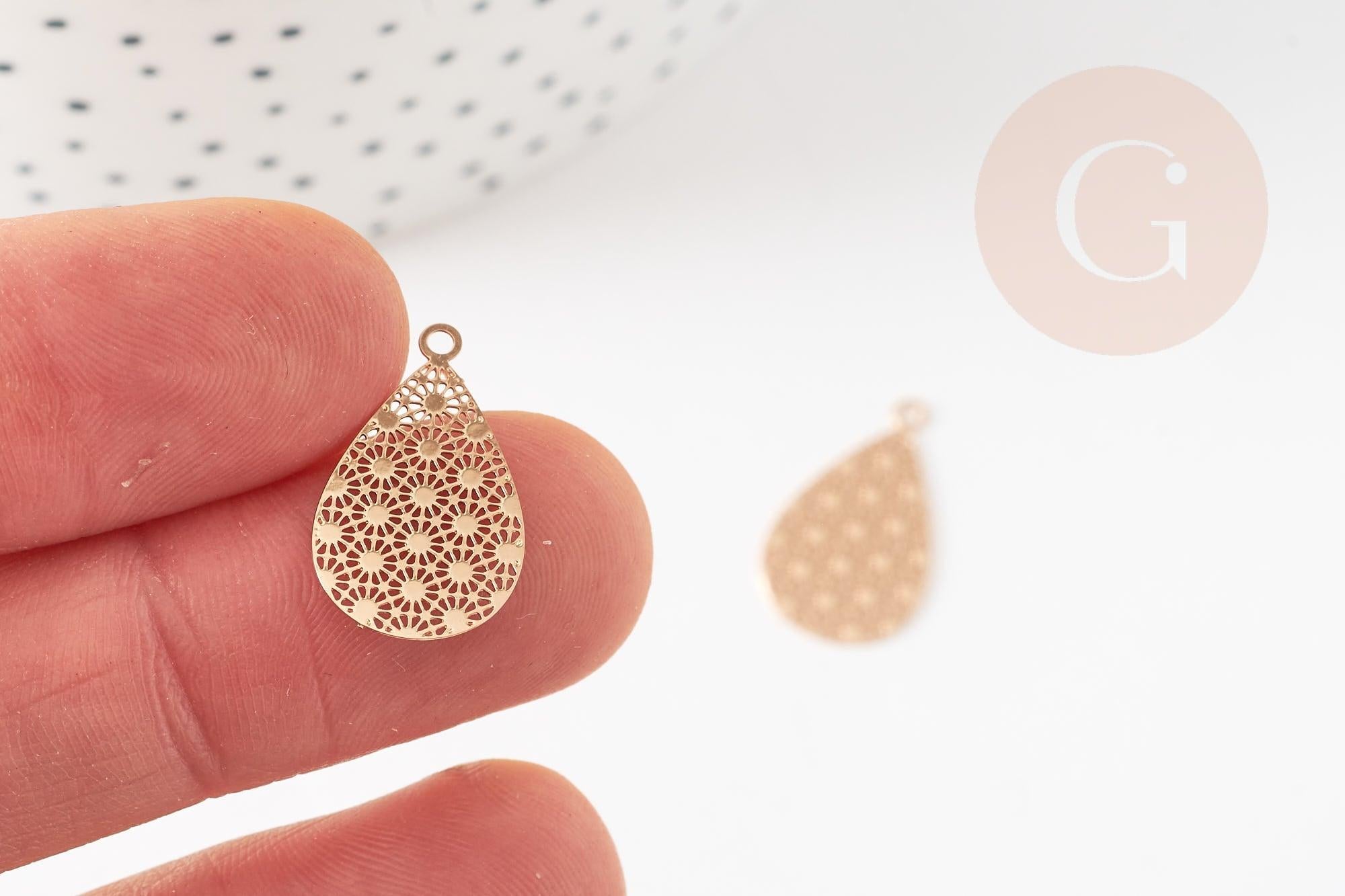 Pendentif estampe filigrane goutte motif géométrique laiton doré 19.5mm, Pendentif très fin et léger pour création de bijoux, x2 (G9279)