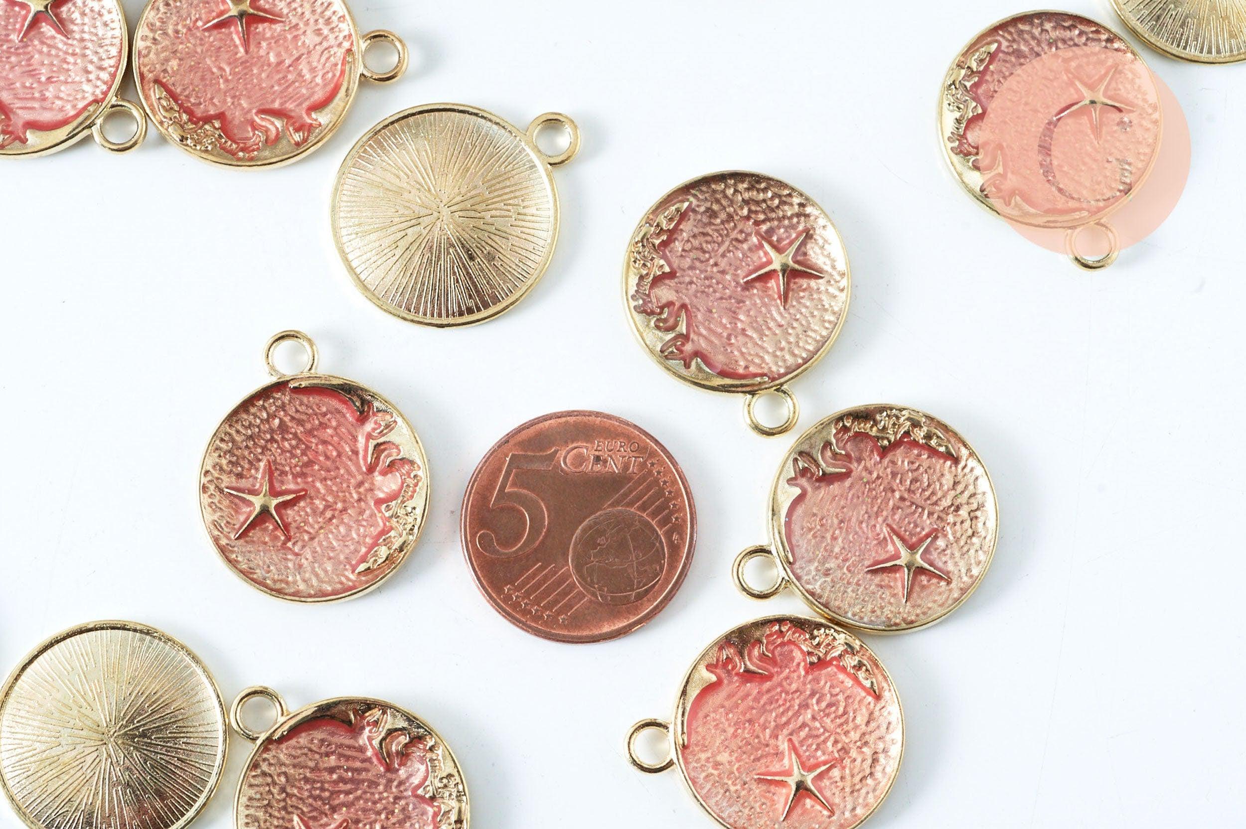 Une jolie médaille en zamac doré représentant une lune avec une étoile, le tout émaillé de résine rose transparente.