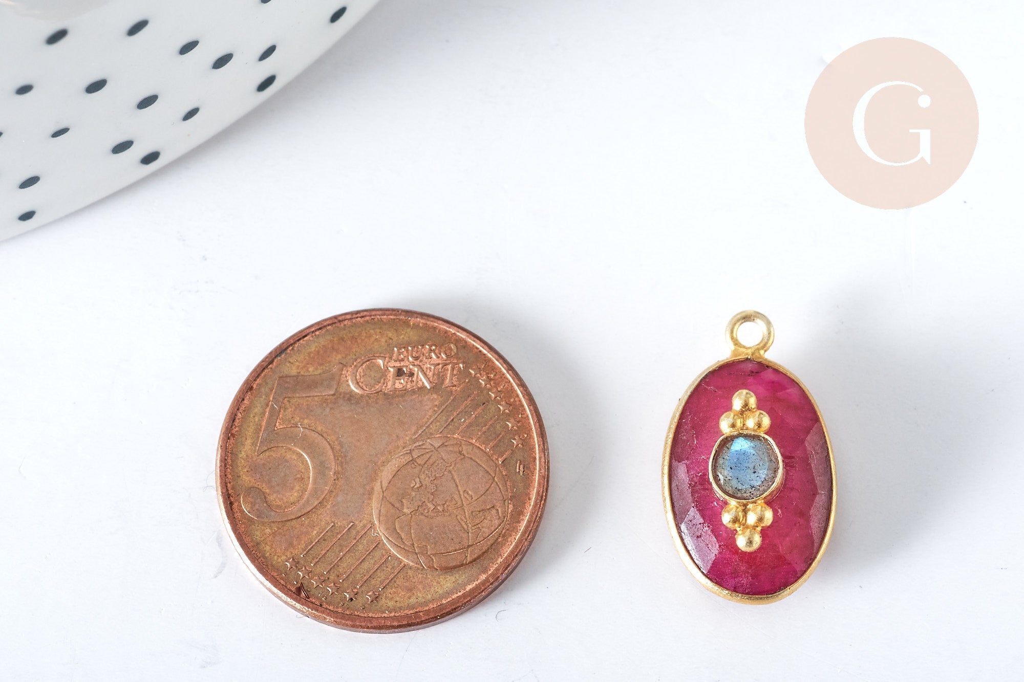 Un sublime pendentif amulette en rubis naturel pour créer des bijoux dans la tendance des pierres naturelle. Il est décoré d'un petit cabochon en labradorite qui lui donne un aspect tendance et original.