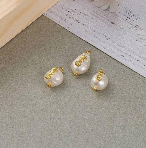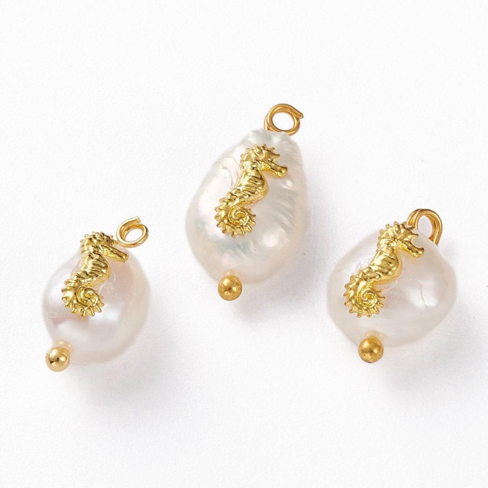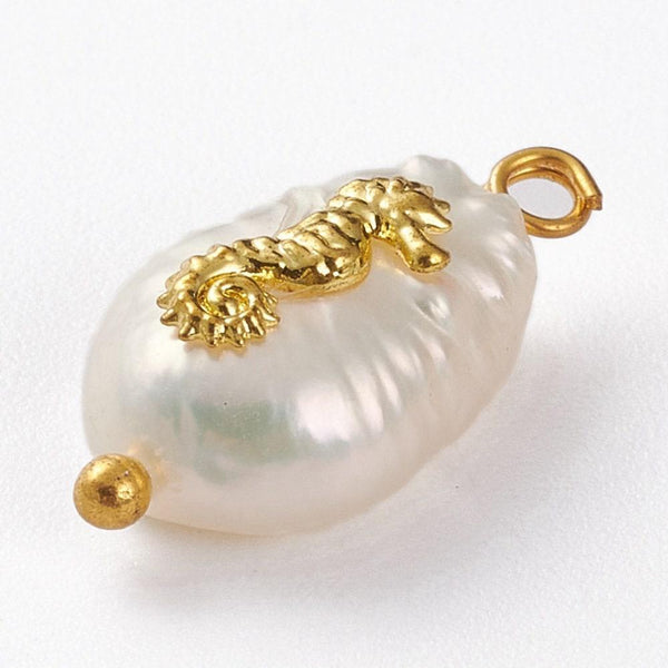 Un pendentif en Perle Keshi naturelle décoré d'un apprêt hippocampe en zamac doré, sur un support en laiton doré. Sa forme irrégulière la rend particulièrement adaptée à la création de bijoux DIY originaux et tendances!
