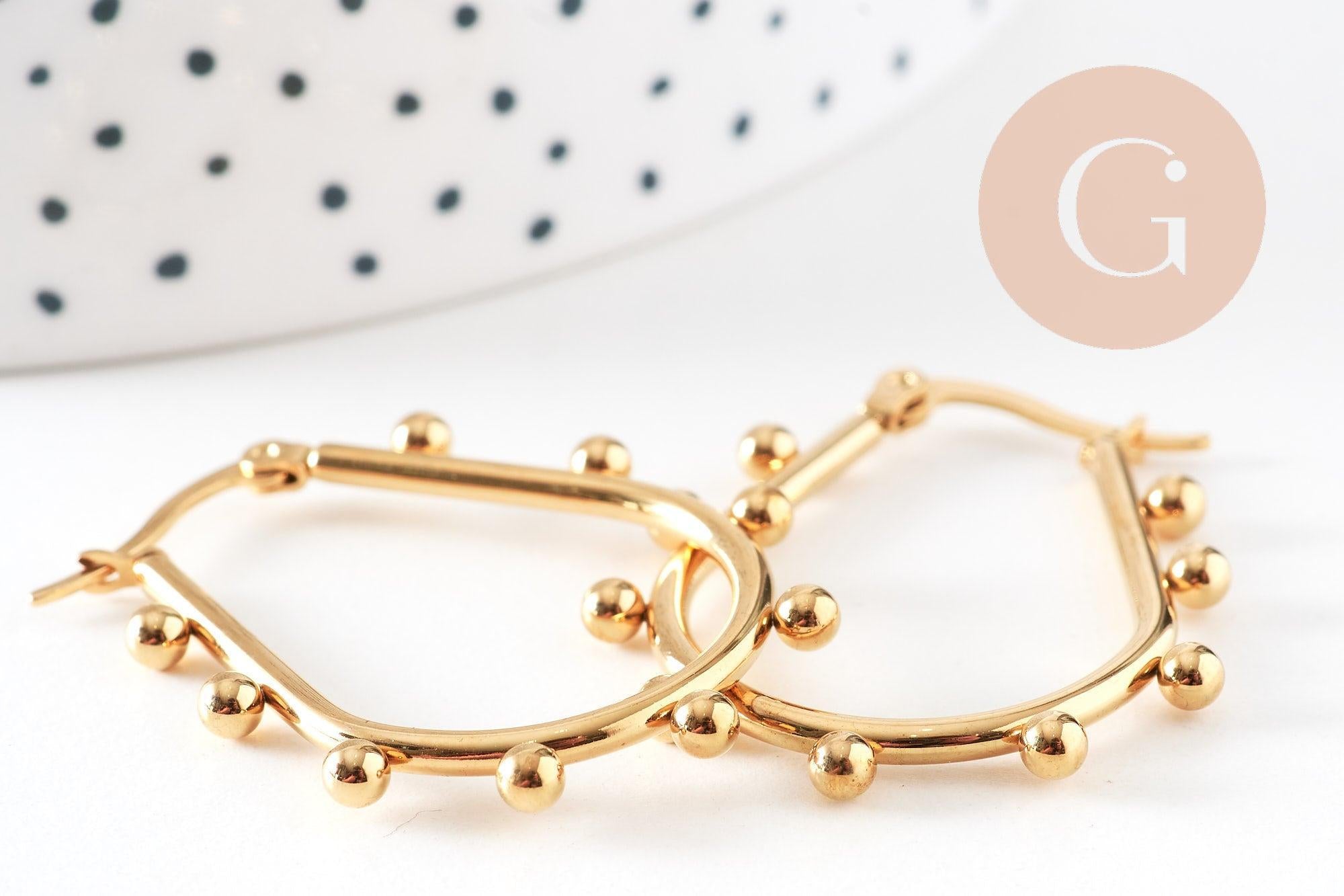 Des boucles d'oreilles créoles en forme de goutte en acier doré décorée de boules