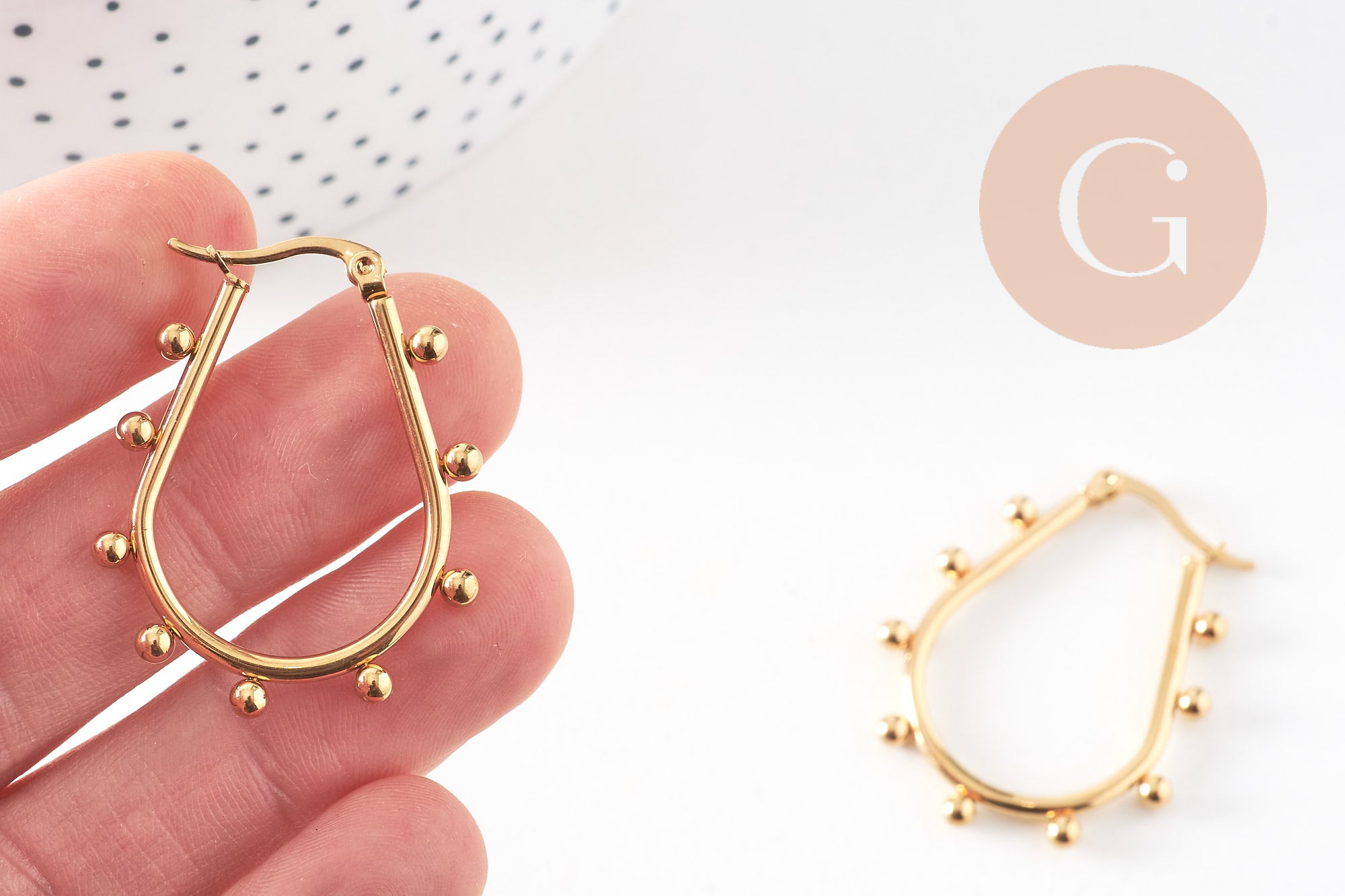 créoles goutte acier doré boules, bijoux doré,création bijoux, oreille percée,sans nickel, la paire, boucles acier, 36.2mm