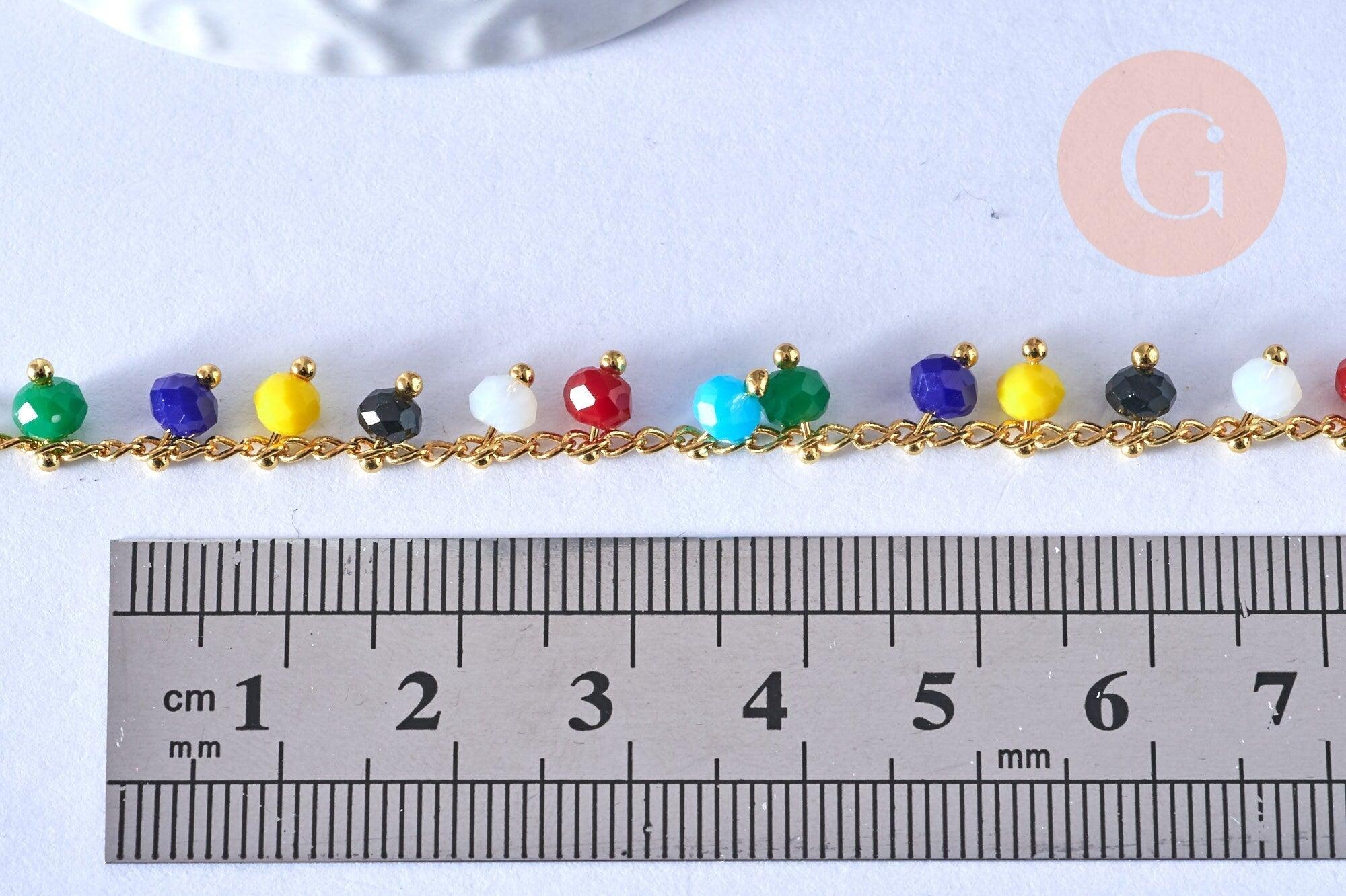Une chaîne de cheville féminine en laiton doré 14k décorée de perle facettées multicolores en verre sur une chaine dorée.
