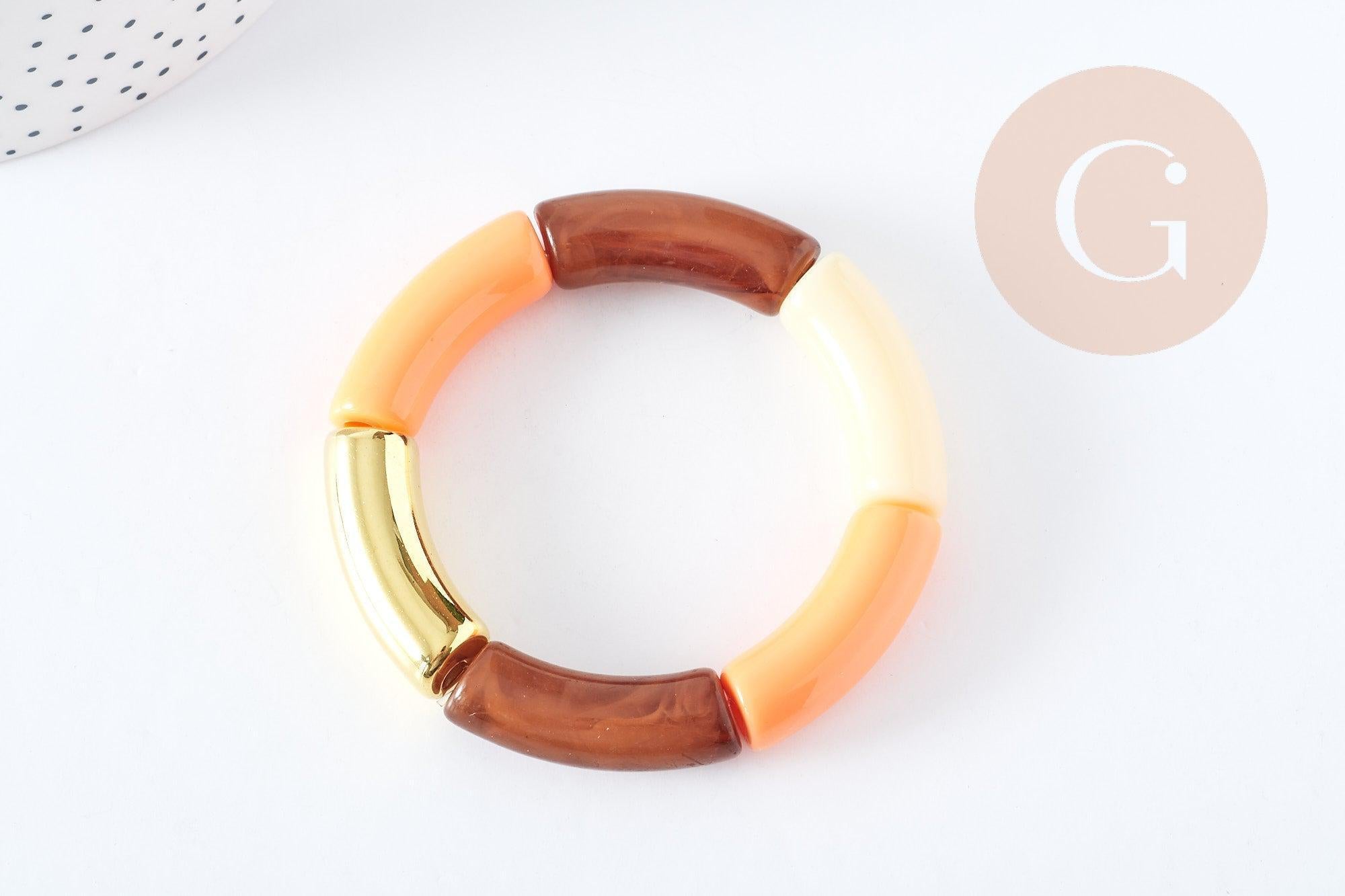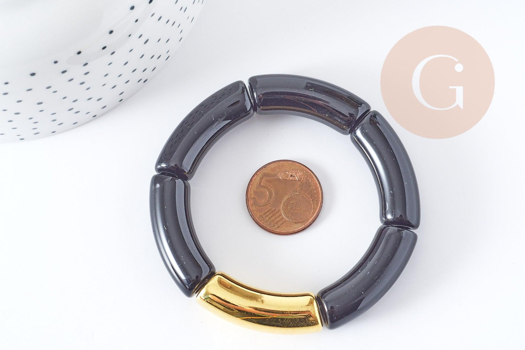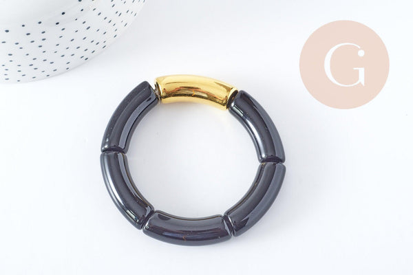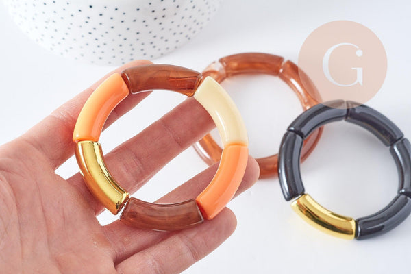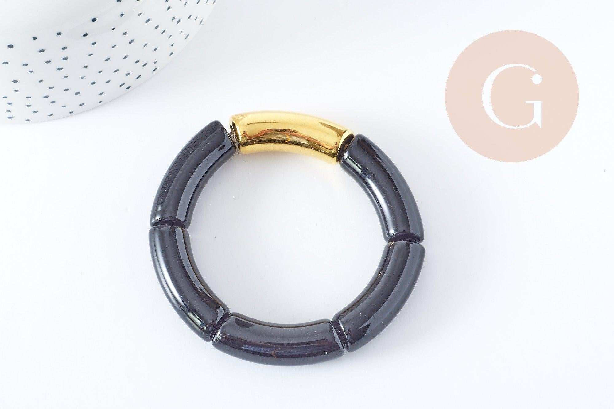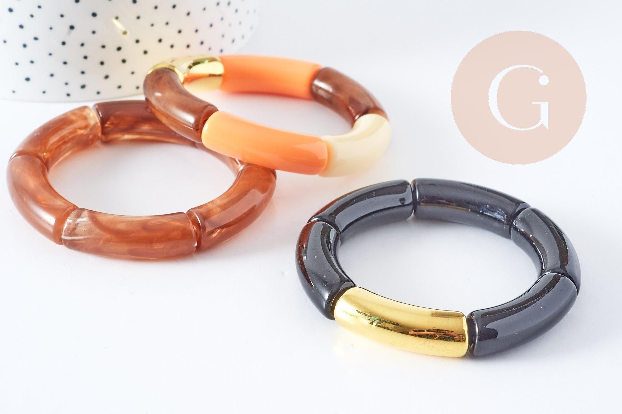 Ce bracelet jonc élastiqué en résine va réhausser vos looks ! Son mélange ambre, noir et doré donnera un côté très chic tout en étant facile à porter.