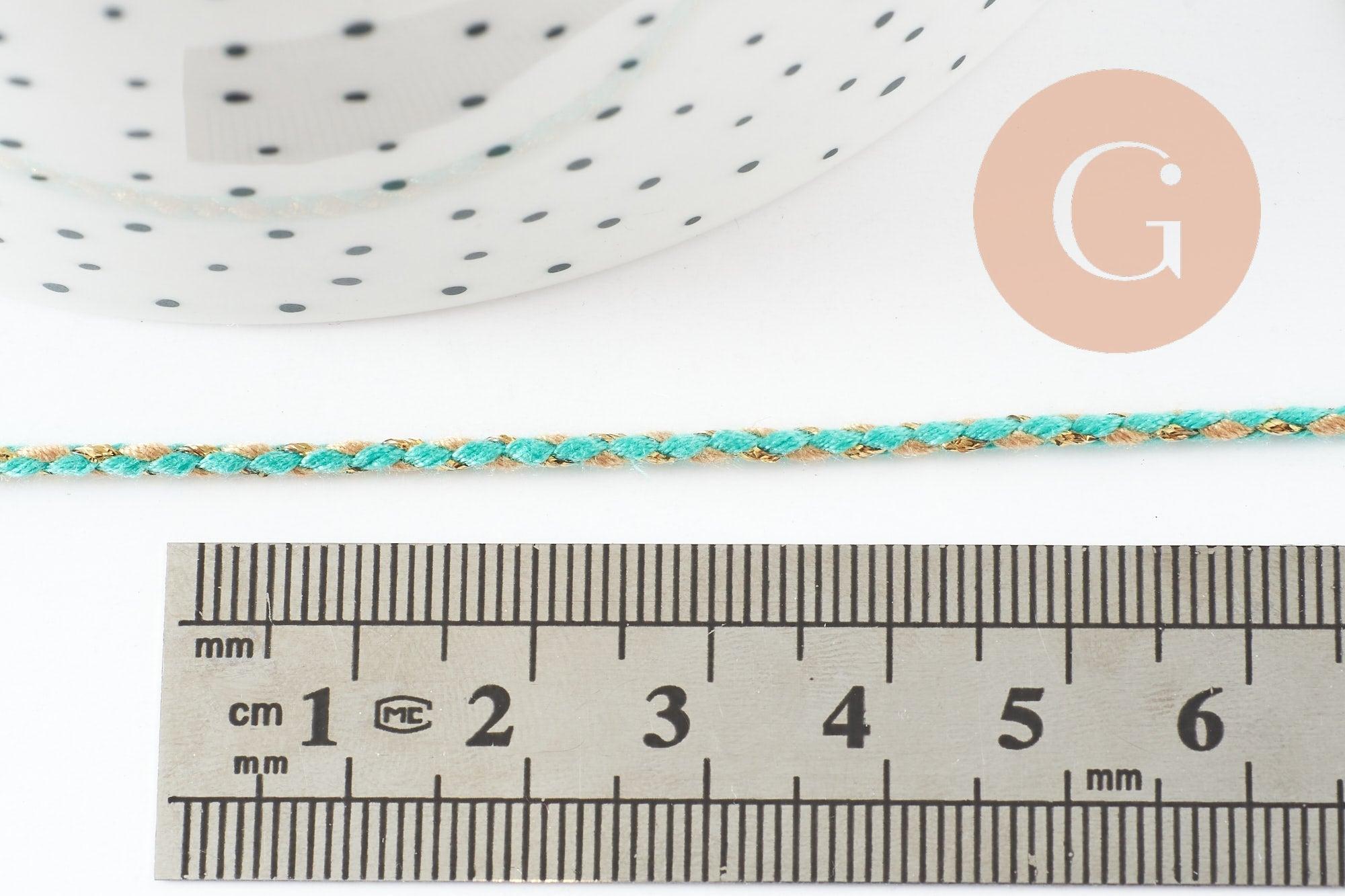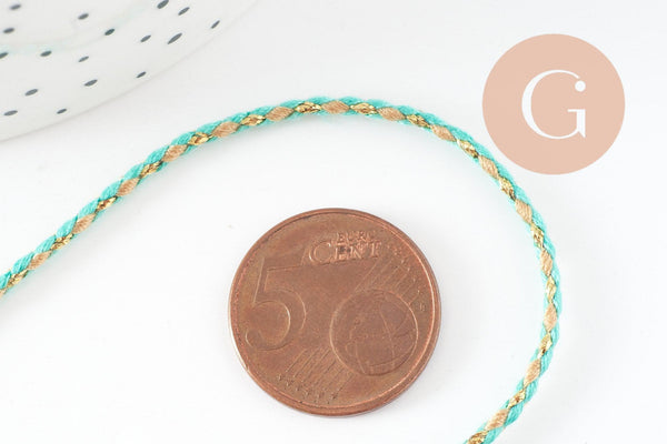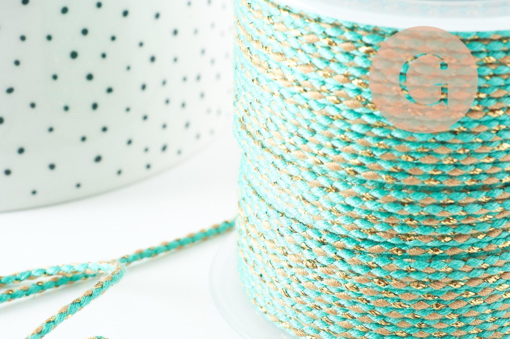 Ce cordon or, vert, jaune turquoise est composé de trois fils de polyester colorés tressés.