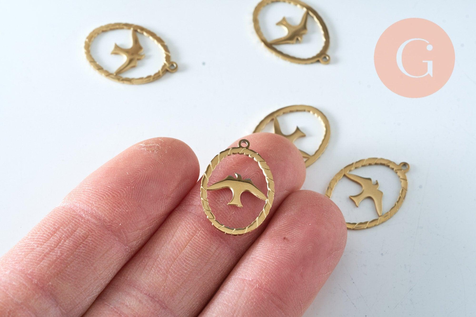Pendentif ovale oiseau acier doré 21.5mm, breloque hirondelle acier inoxydable doré, pendentif sans nickel, création bijoux, x1 (G6019)