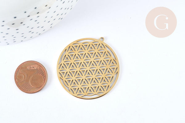 Pendentif estampe filigrane rond fleur de vie acier inoxydable 201 doré 42mm, création bijoux acier inoxydable, x1 G7256