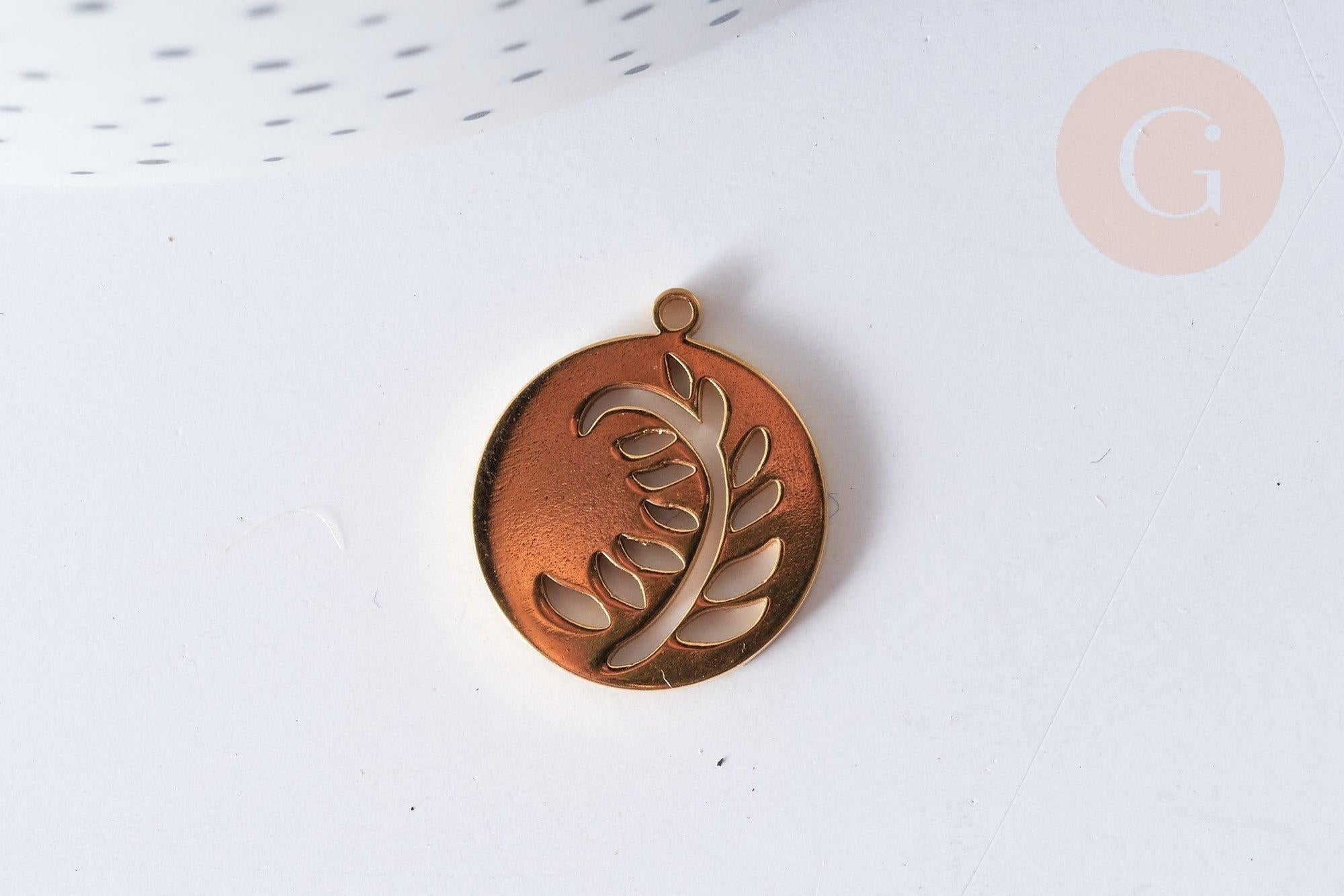 Ce pendentif plat de forme ronde avec une feuille ajourée est en acier 201 inoxydable doré. L'acier est hypoallergénique et est très résistant.