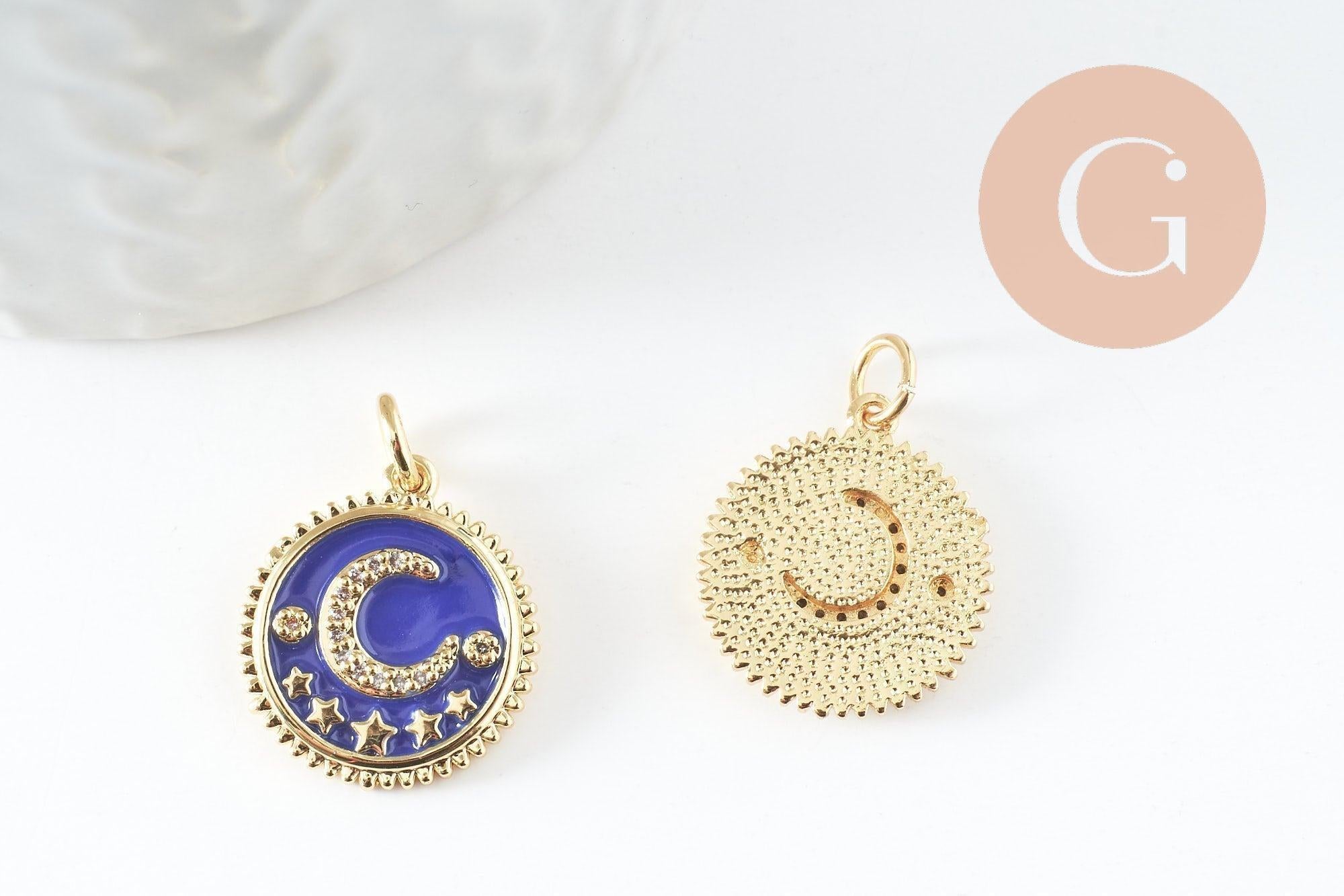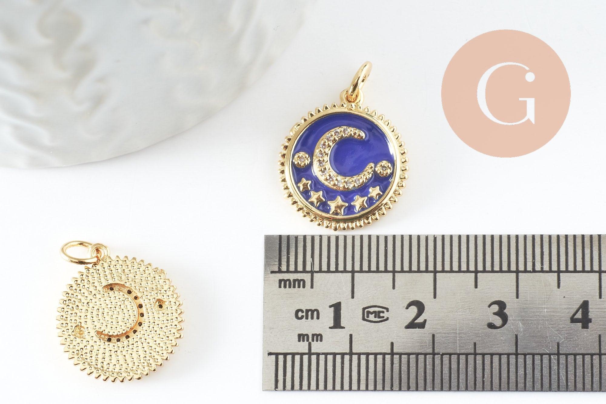 Pendentif médaille rond lune étoiles émail bleu laiton doré zircons, pendentif laiton émaillé,sans nickel,18mm, x1 (G5270)