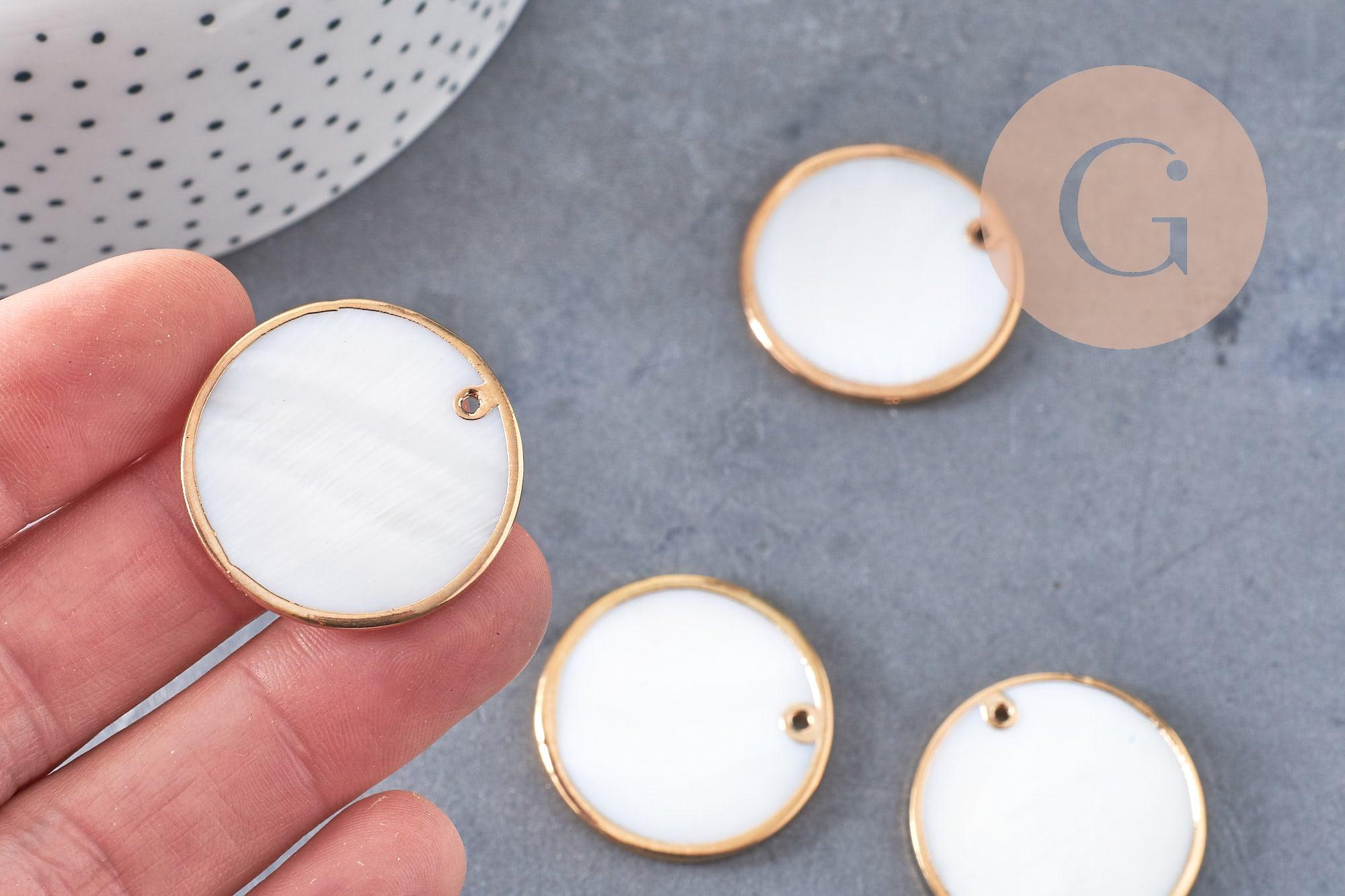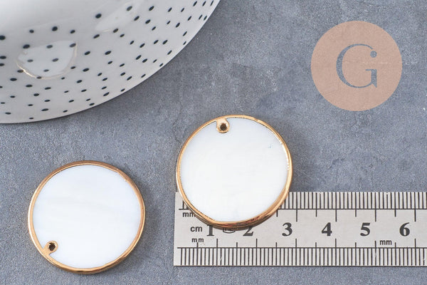 Pendentifs dorés ronds coquillage naturel en nacre blanche 30mm, création bijoux coquillage x2 (G1843)