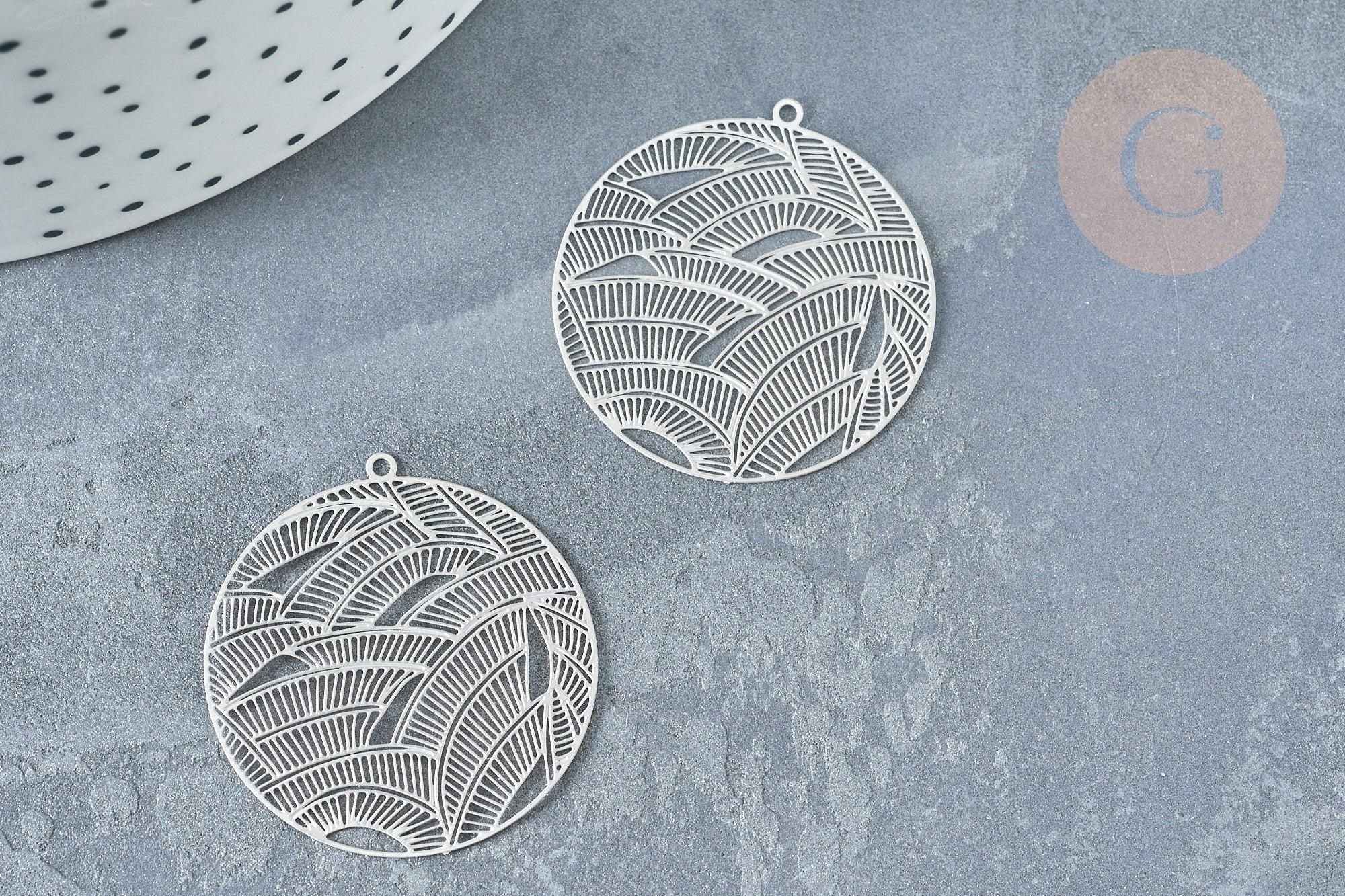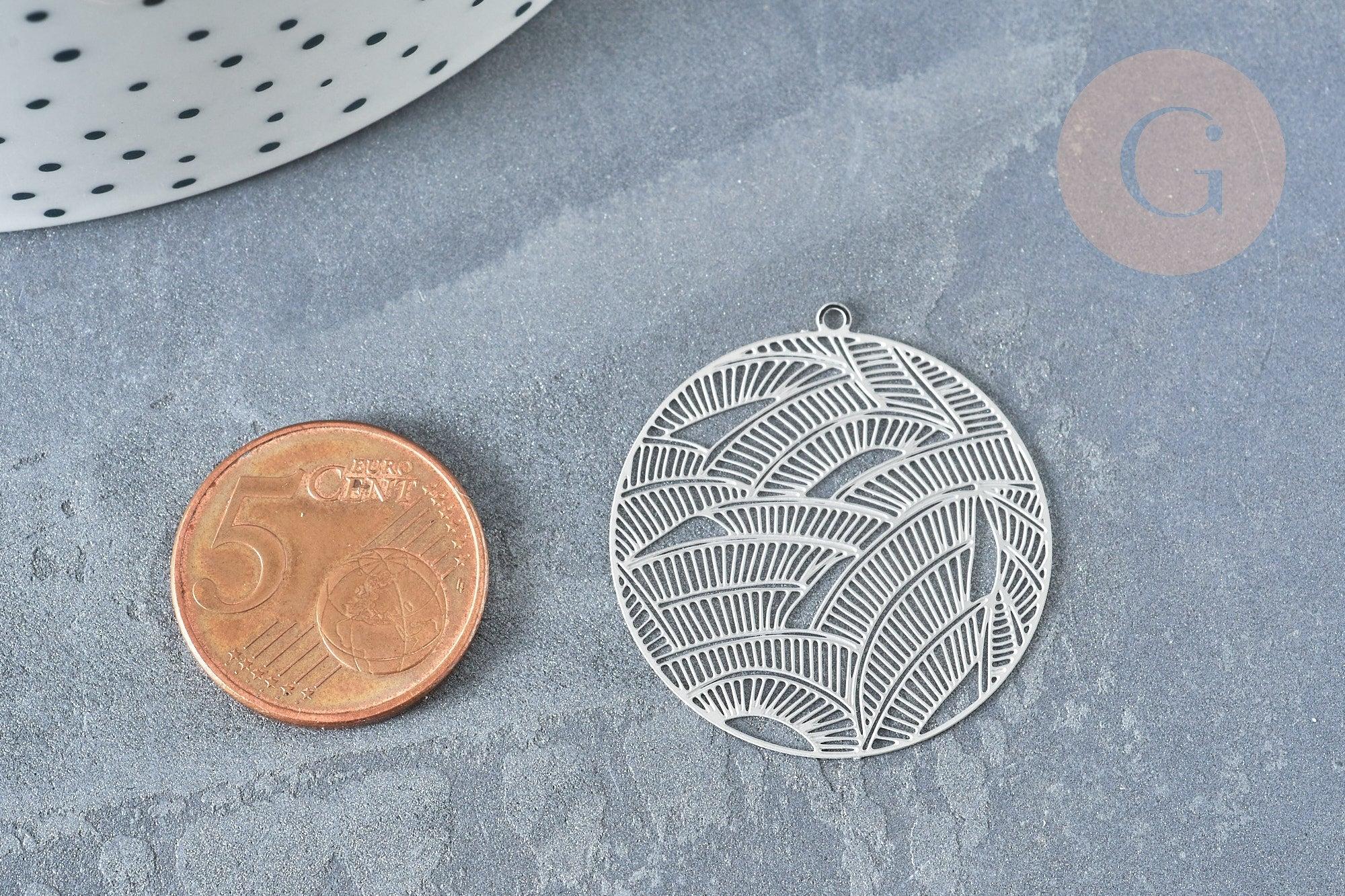 Pendentif estampe filigrane rond feuille acier 201 inoxydable argenté 31.5mm, Pendentif très fin et léger, x 2 (G8261)