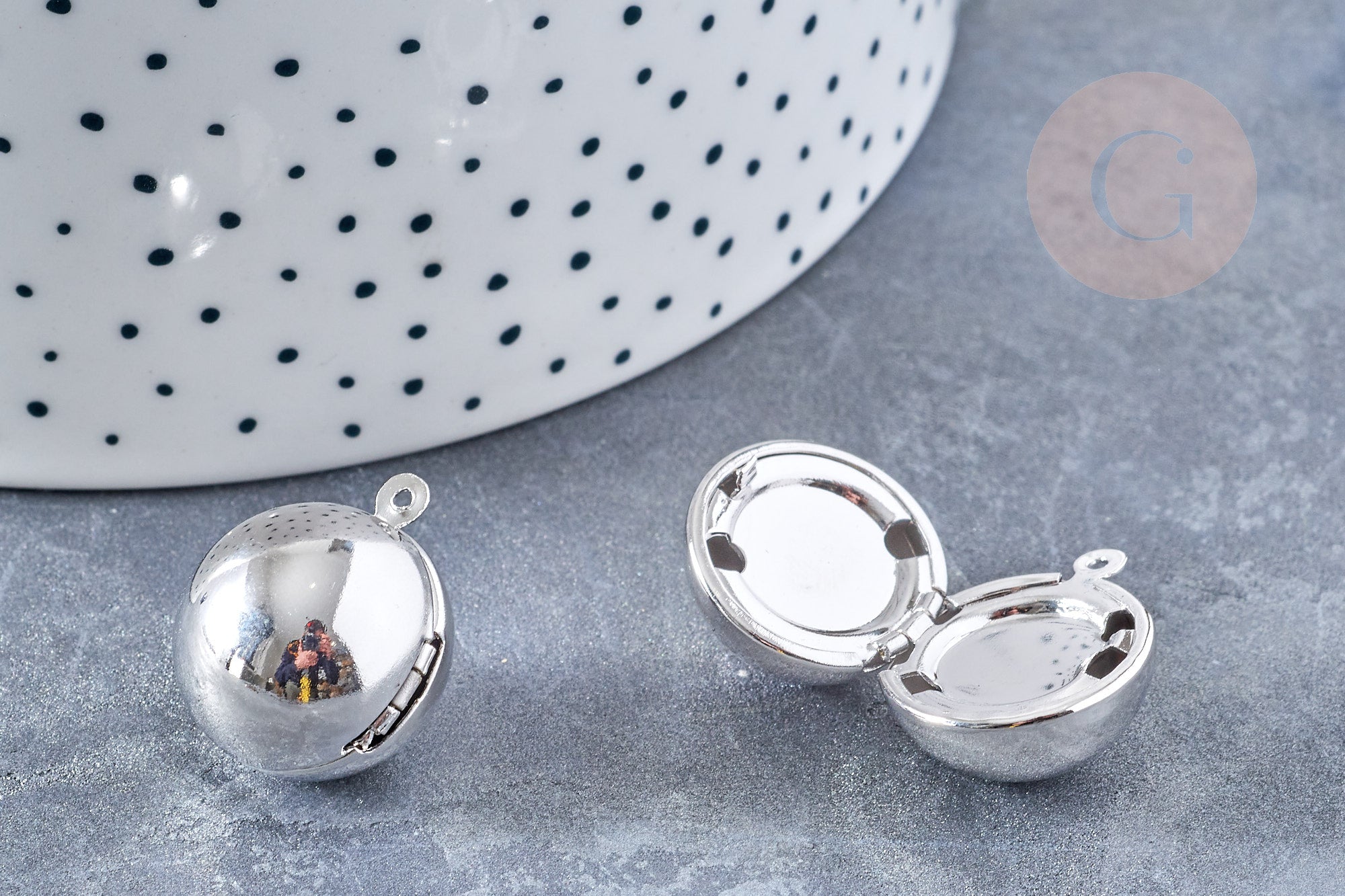 Découvrez ce magnifique pendentif locket rond boule en laiton finition or blanc (rhodié), la fourniture créative idéale pour vos projets de bijouterie. Ce médaillon photo de 18mm est orné d'une finition en rhodium qui lui confère un aspect luxueux et sophistiqué.