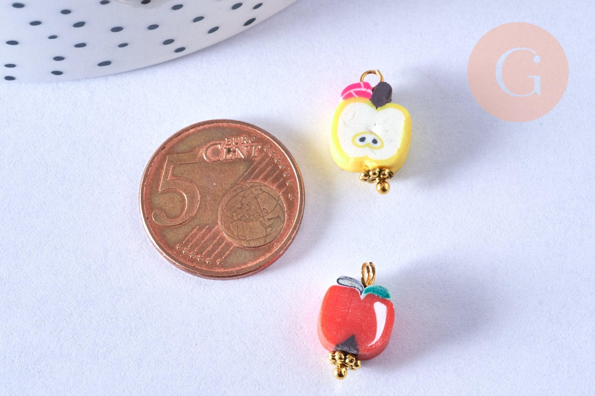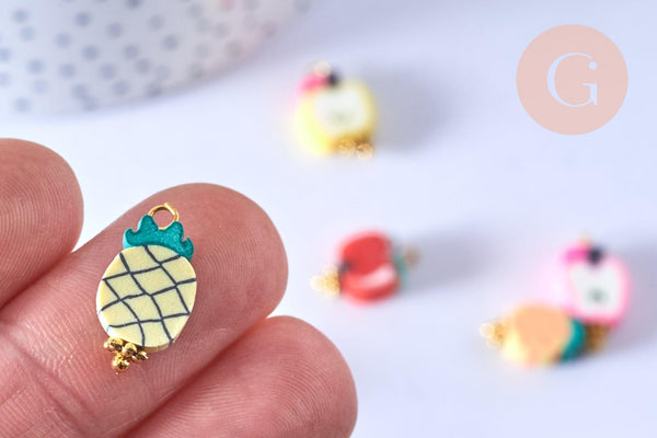 Ce lot comprend un mélange de petits pendentifs breloques fruits en pâte polymère multicolore sur un support en zamac doré.