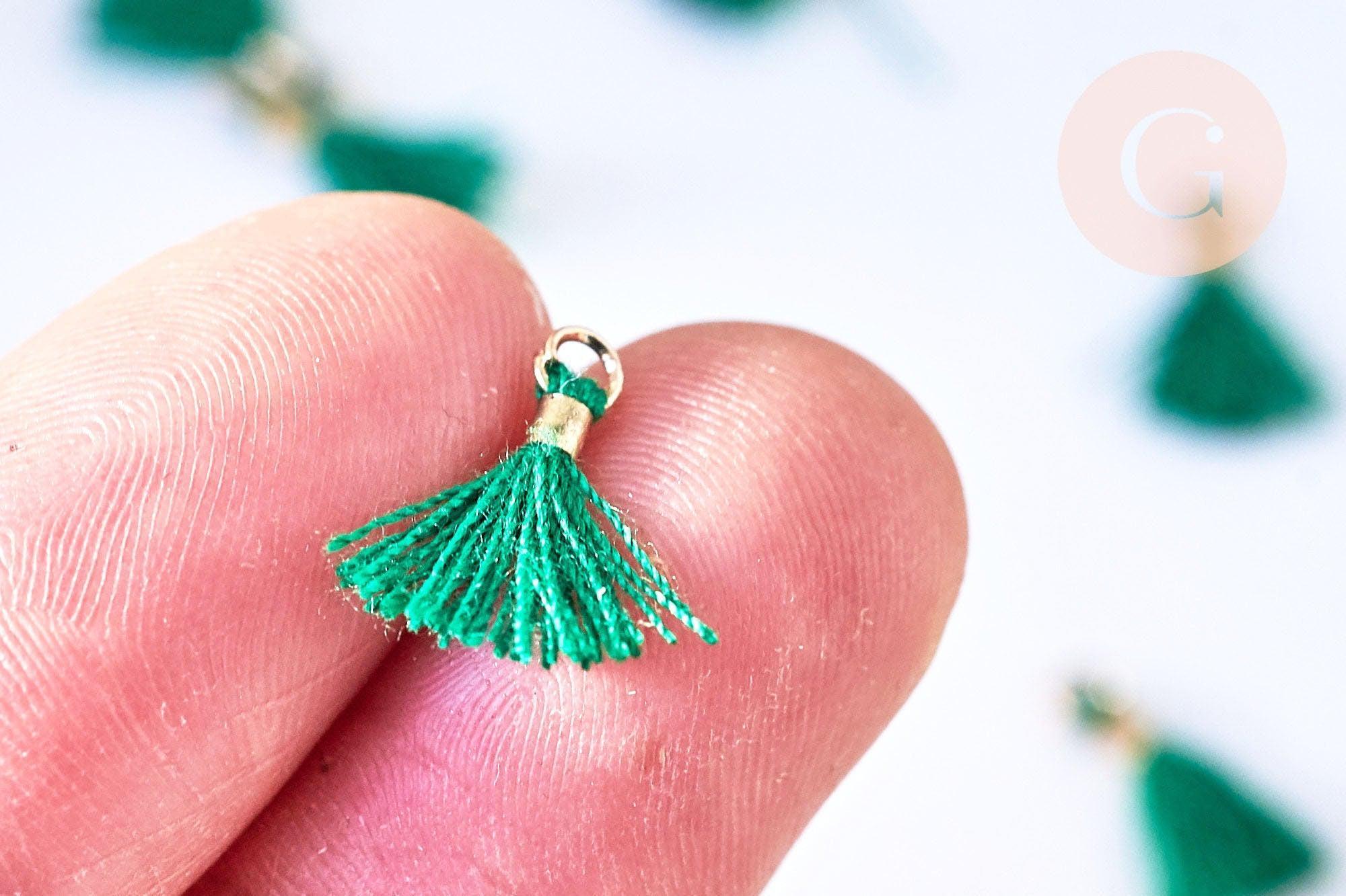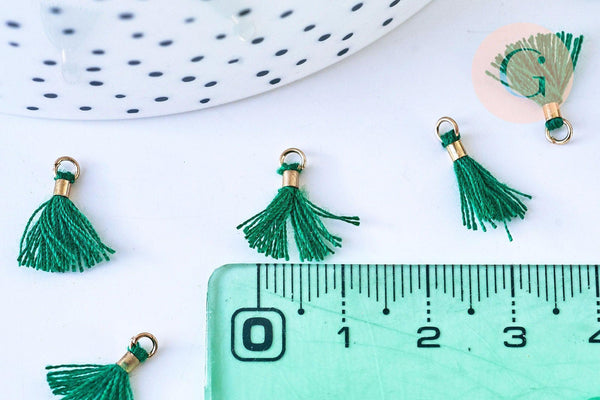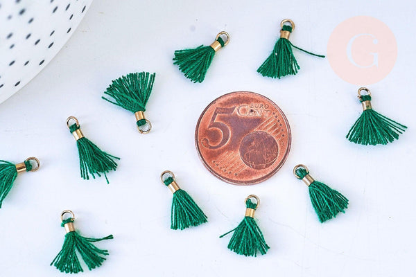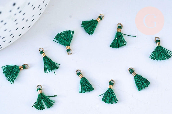 Pompon vert émeraude polyestère support doré,décoration pompon, pompon boucles,fabrication bijoux bohème,10-15mm, x10 ( G5563)