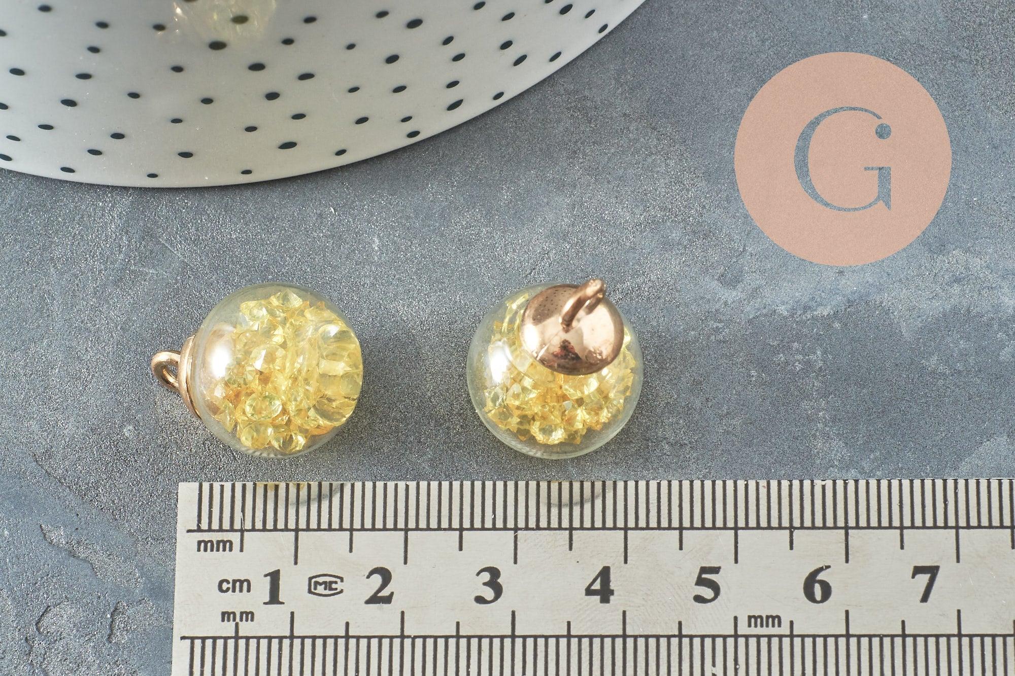Pendentif bulle verre transparent cristal jaune bélière plastique doré 21mm, création sautoir, pendentif vitrine, x1 G9751