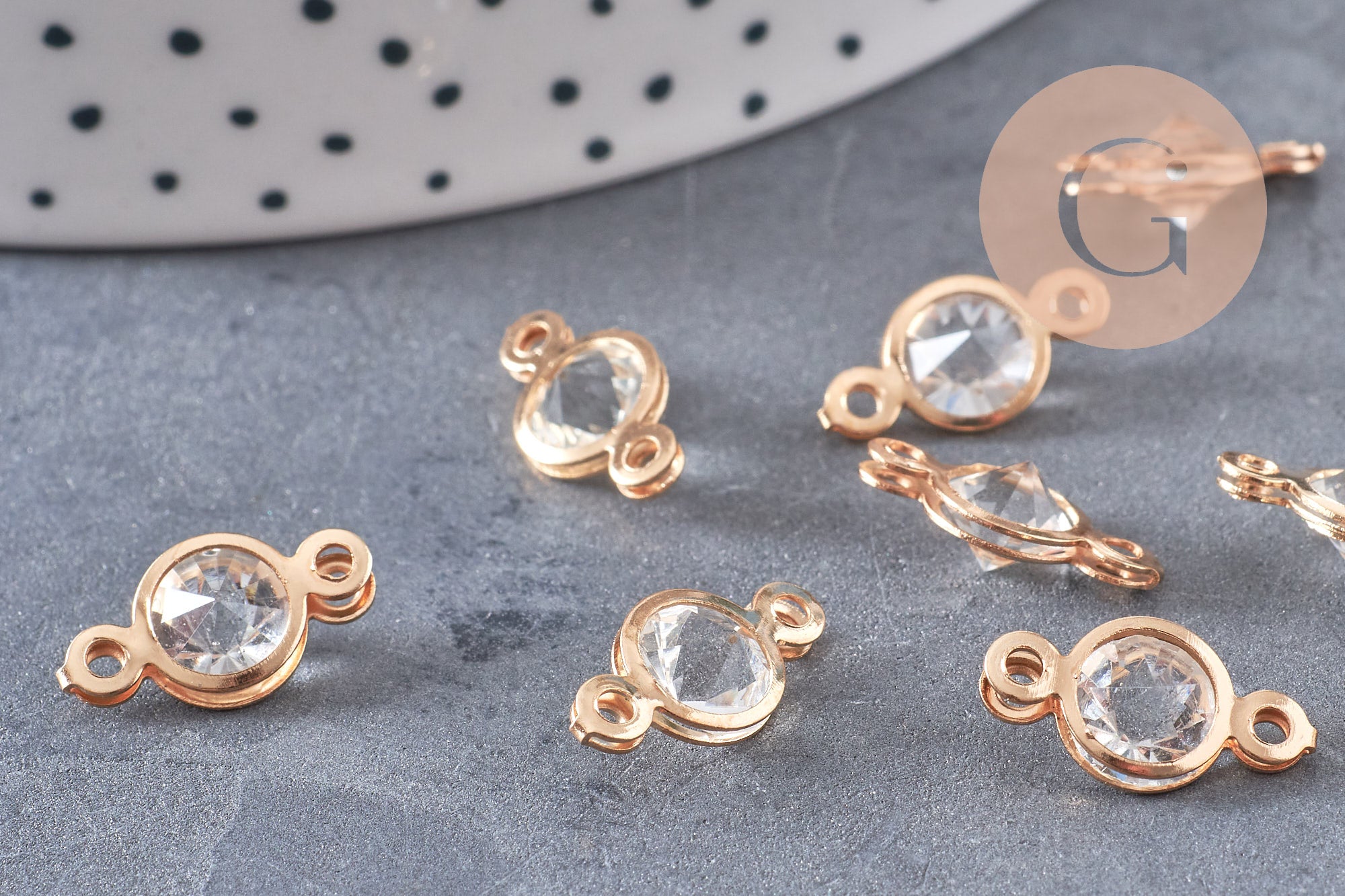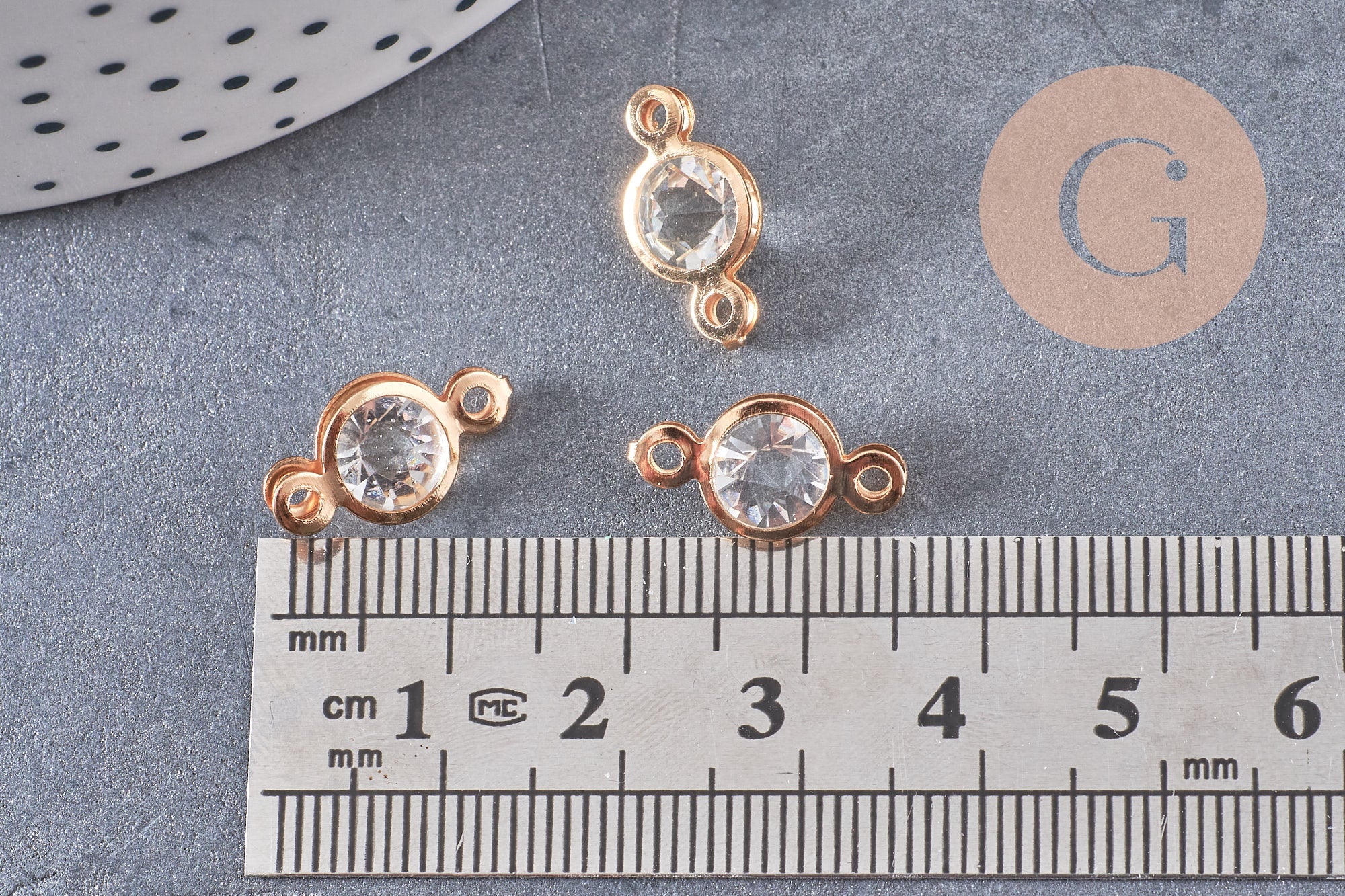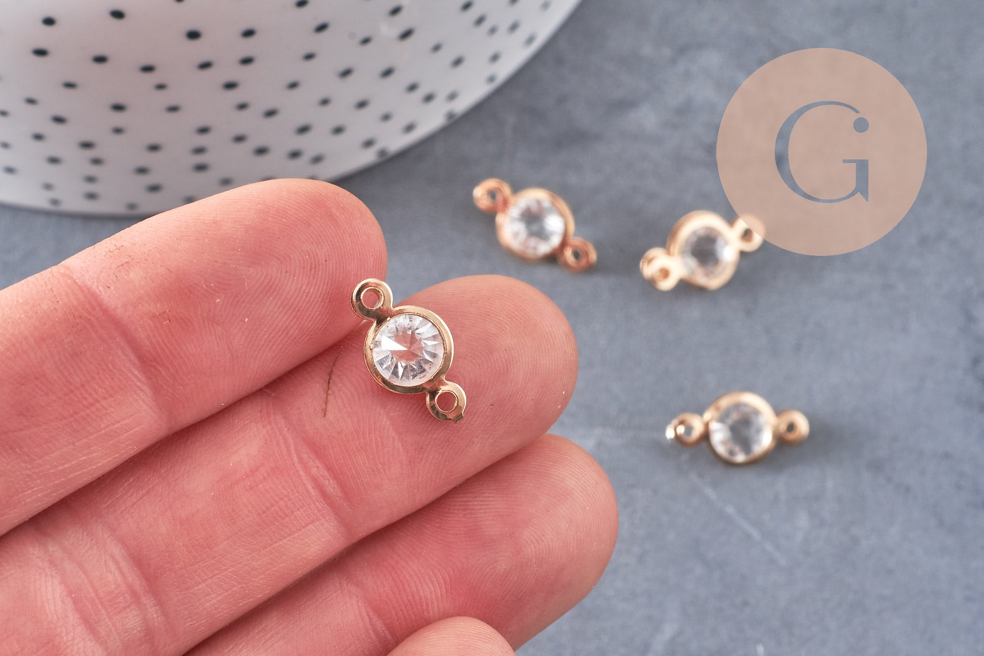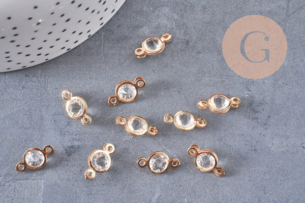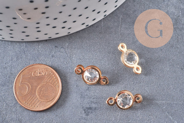 Ce pendentif connecteur rond de 15mm, en fer doré, est orné d’un cristal transparent scintillant, apportant une touche d’élégance et de raffinement à vos créations.