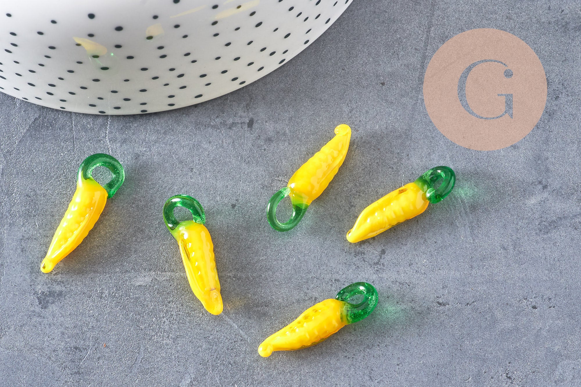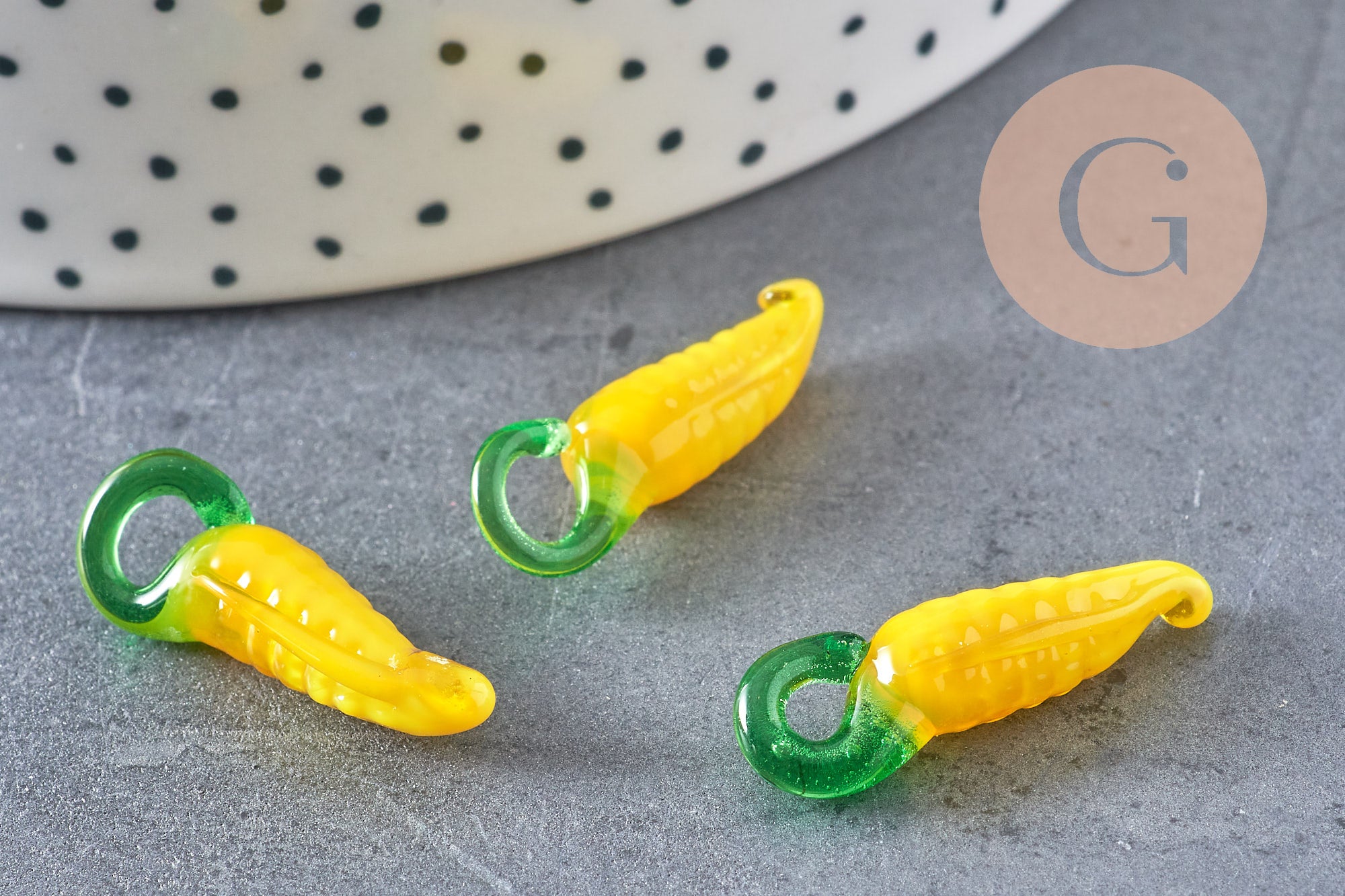 Un pendentif maïs en verre artisanal jaune et vert, à suspendre à vos créoles, colliers et autres accessoires ou bijoux
