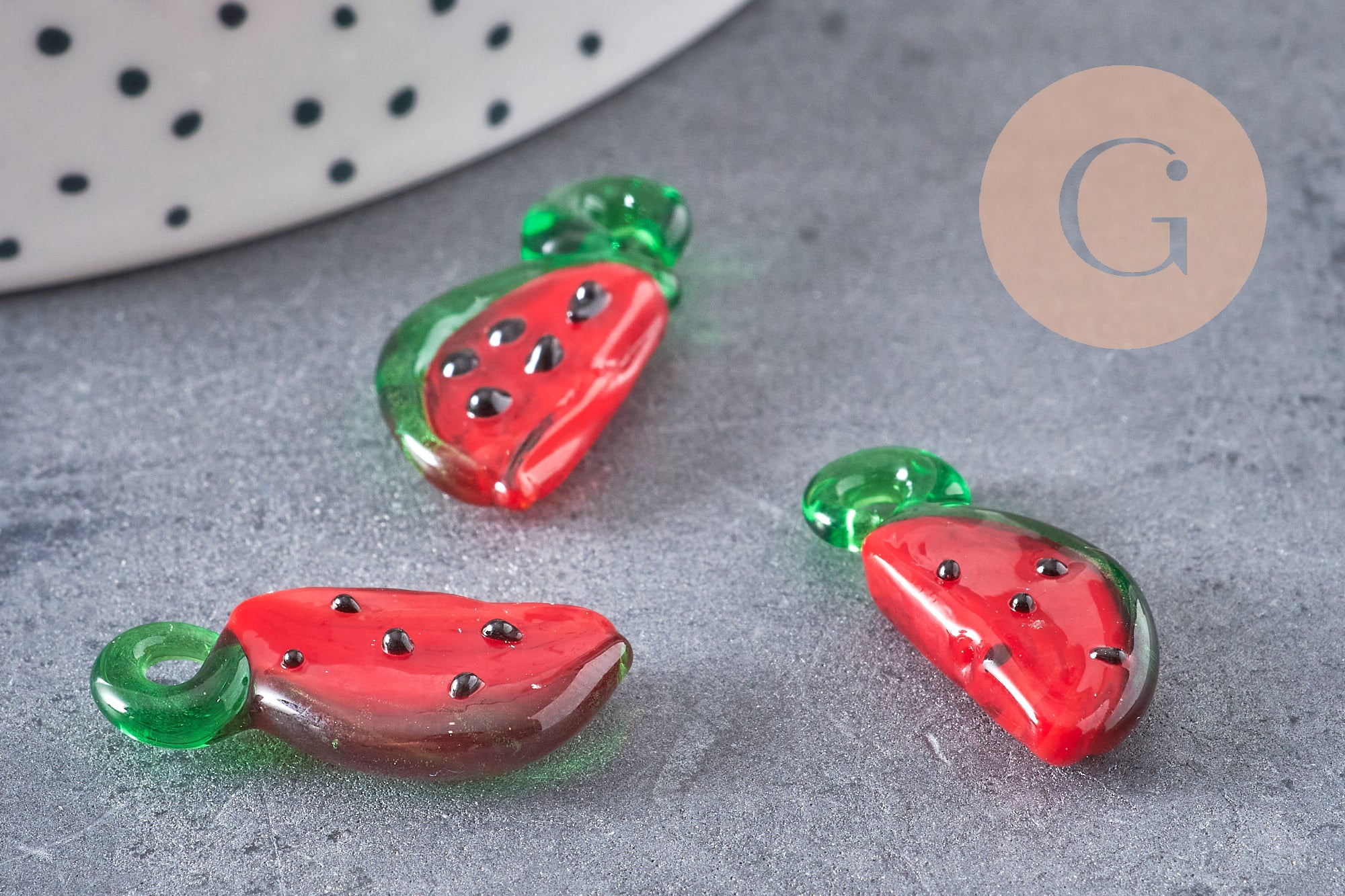 Un pendentif pastèque en verre rouge et vert, à suspendre à vos créoles, colliers et autres accessoires ou bijoux