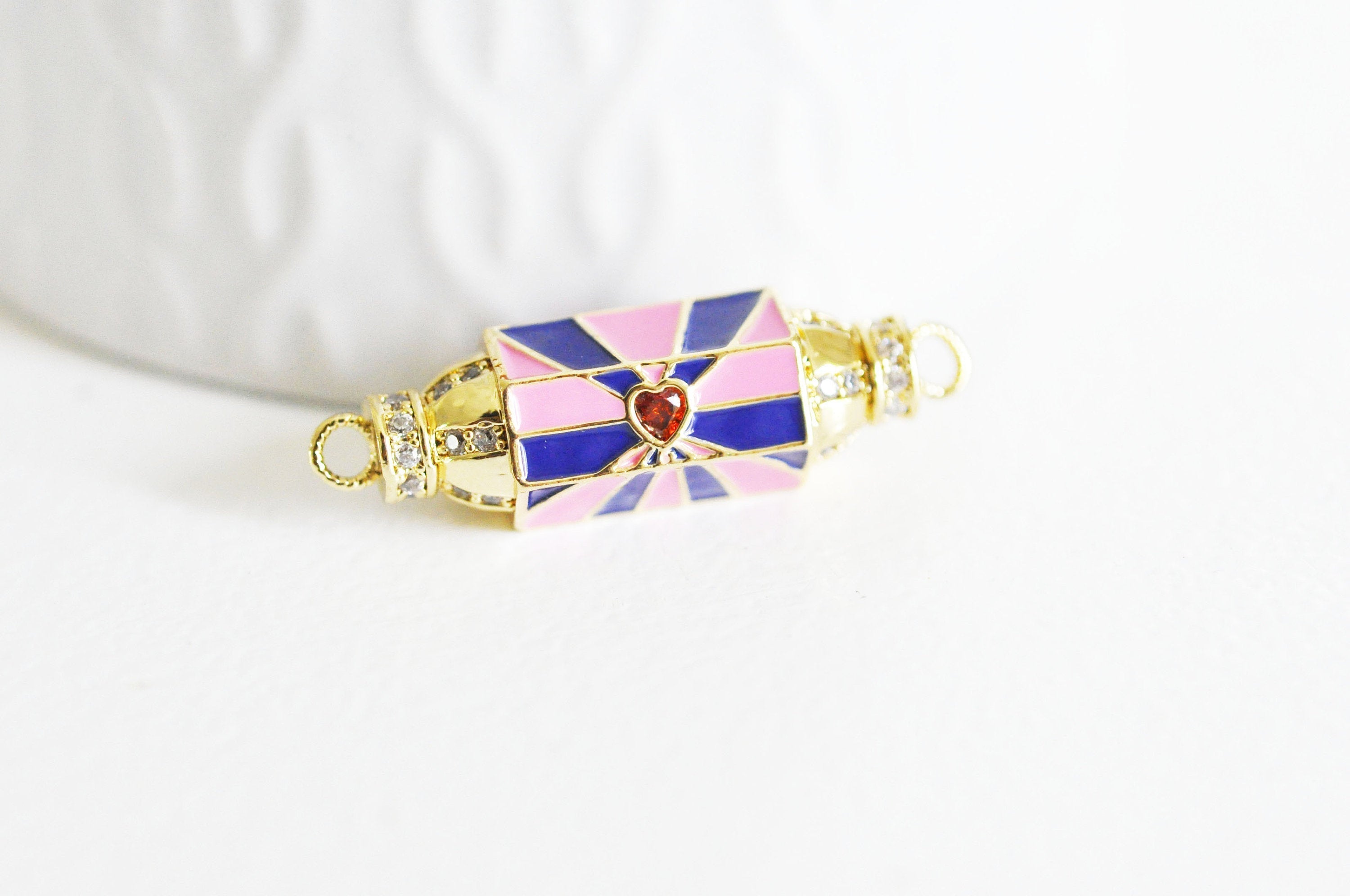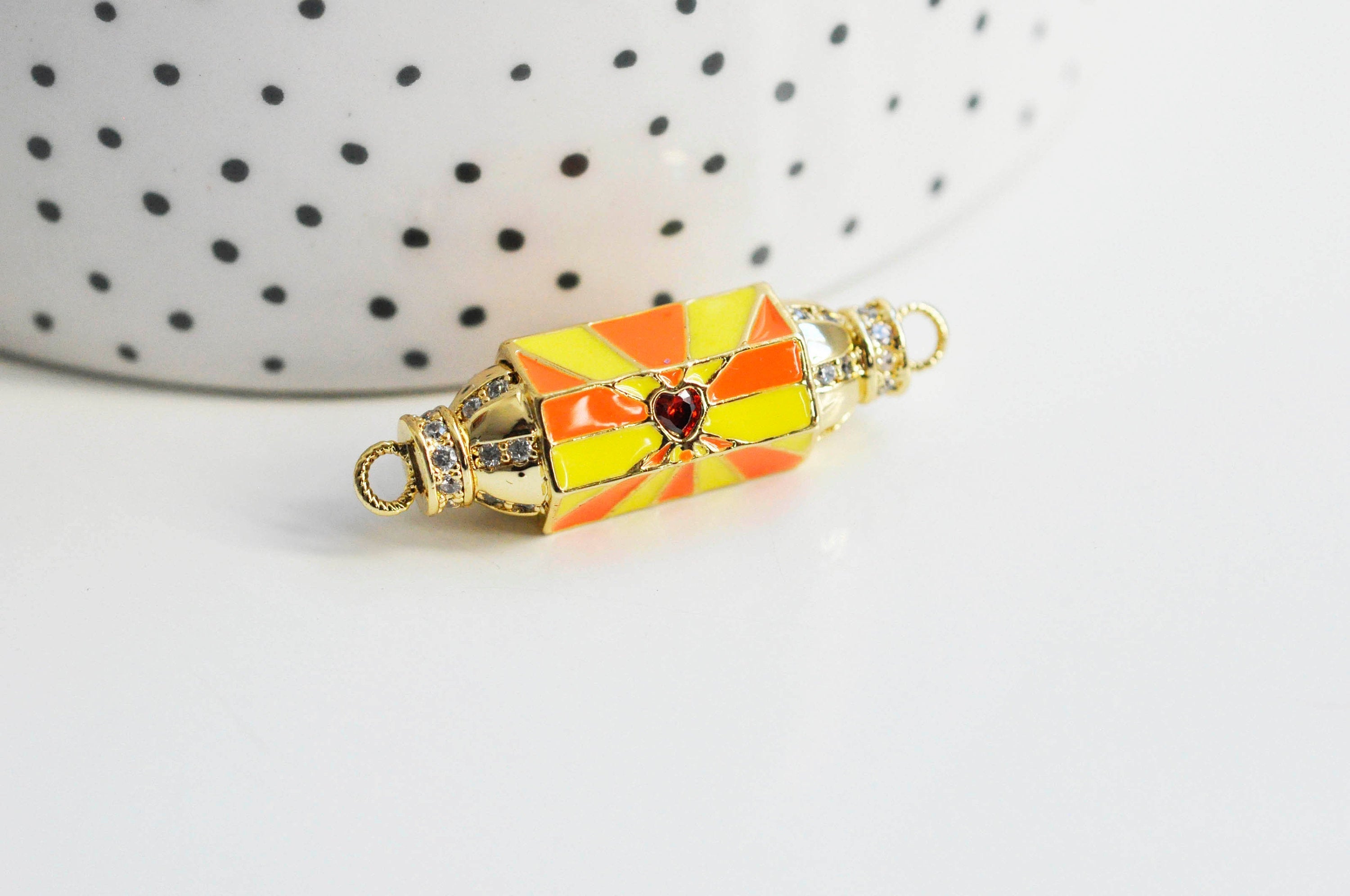 Pour vos bracelets et colliers tendance, voici de magnifiques connecteurs tube en laiton doré, émaillé en orange et jaune et décoré de strass. Un pendentif original que vous pourrez agrémenter d'une pierre, de perles.