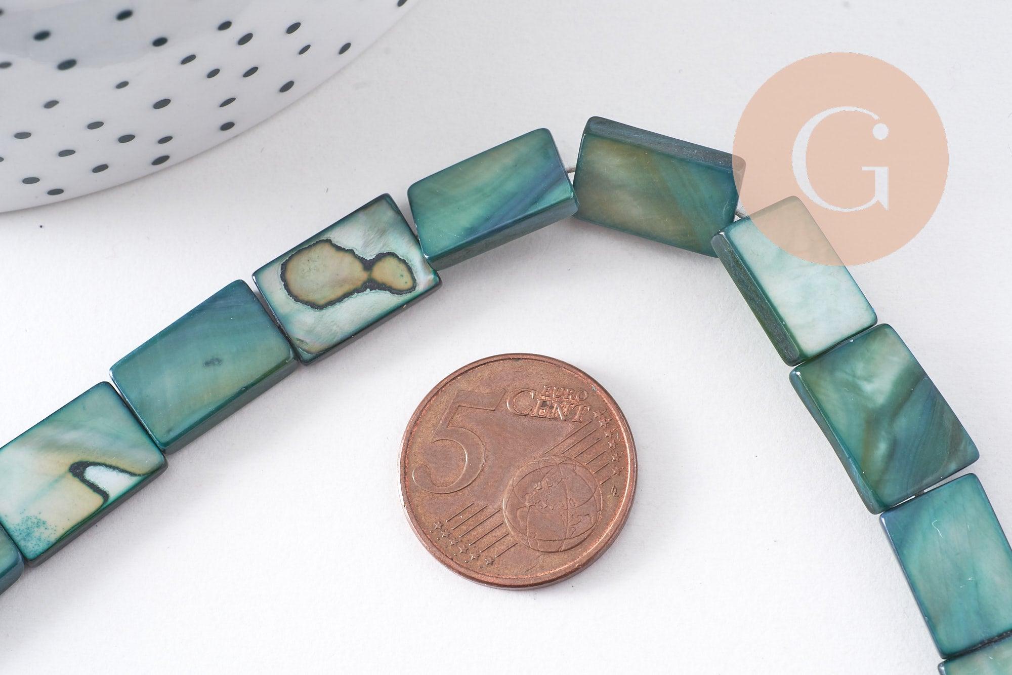 Craquez pour ces perles rectangulaires en nacre naturelle teintée verte, aux reflets doux et lumineux. Leur forme allongée et élégante en fait des perles particulièrement polyvalentes : elles peuvent être utilisées aussi bien comme perles classiques que comme pendentifs, en les montant simplement à l’aide de fil de laiton ou de cuivre.