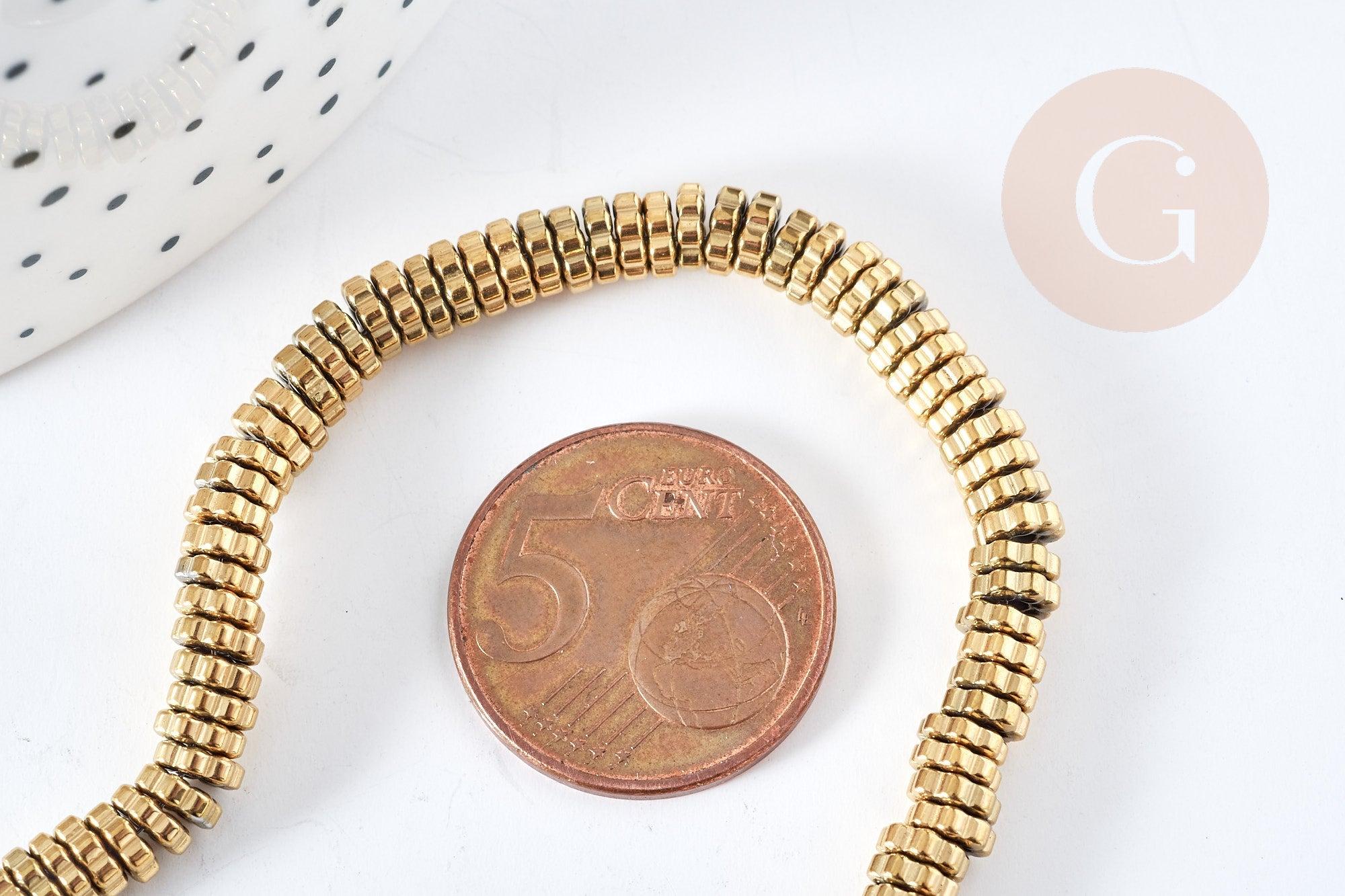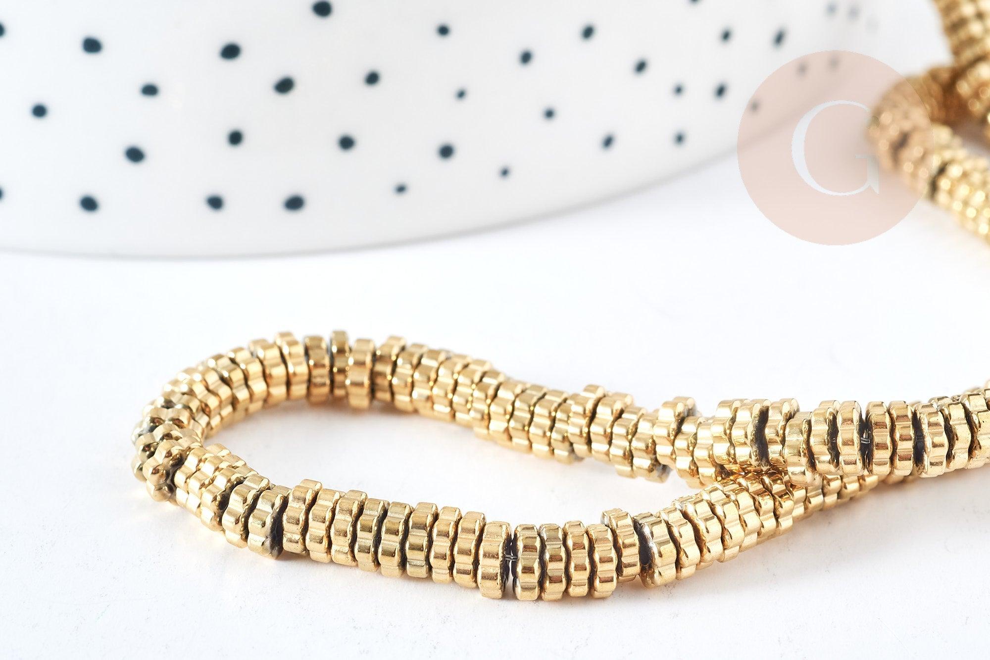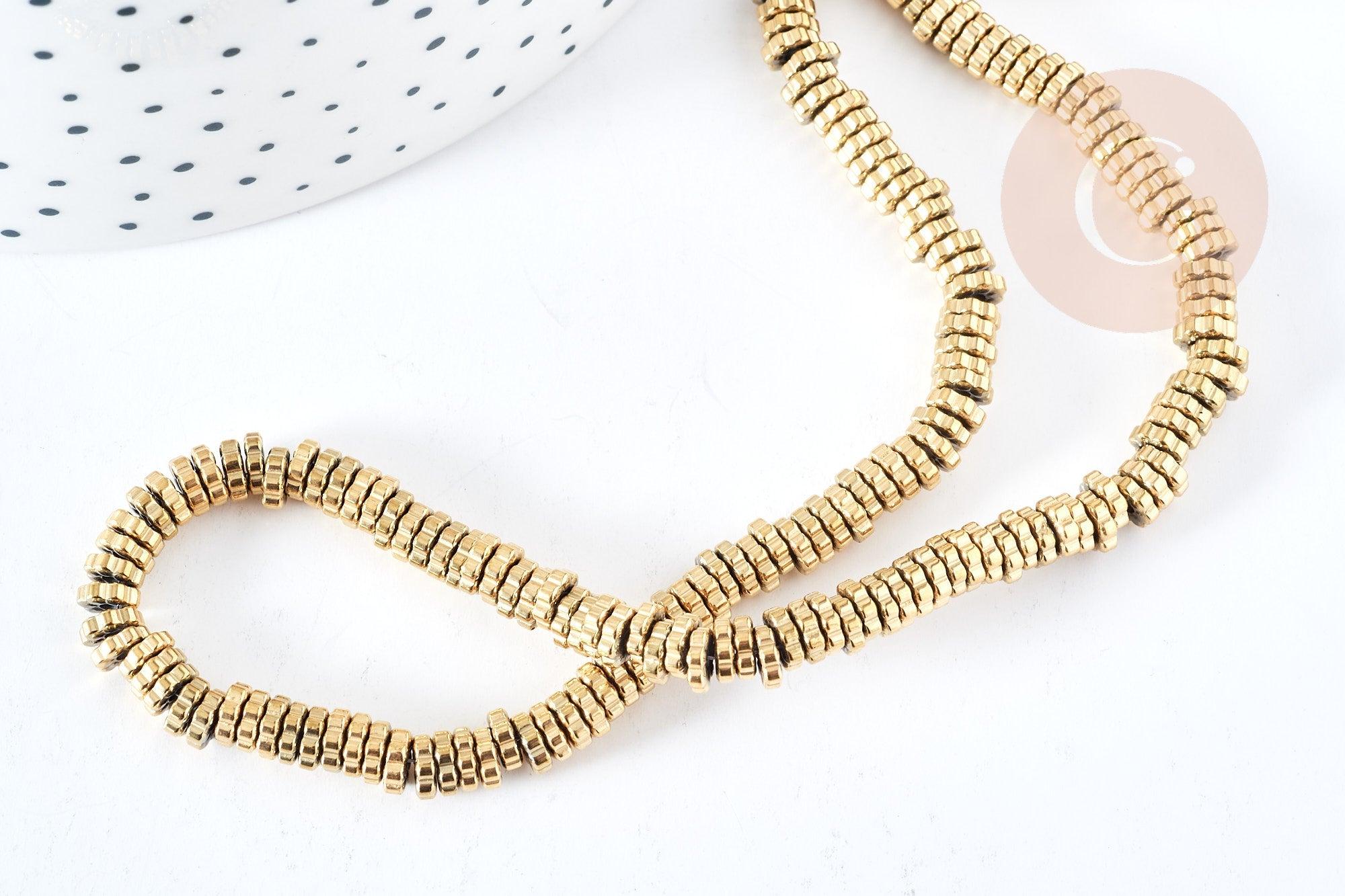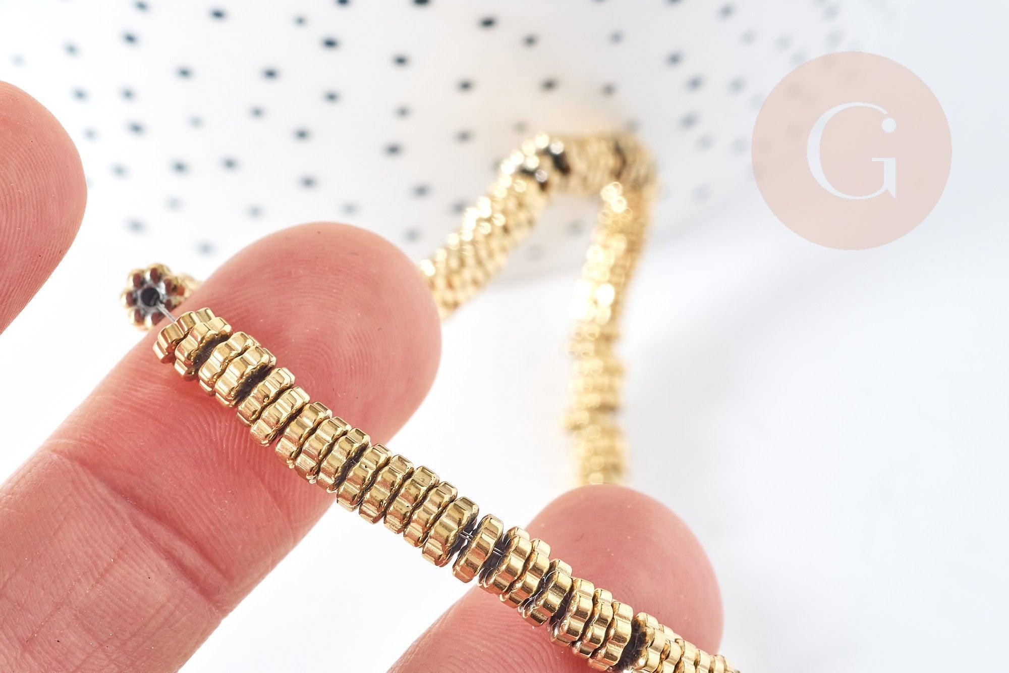 Le lot comprend 40cm de perles rondelles fleurs en hématite dorée 18K, parfait pour créer des bracelets, des colliers et des boucles d'oreilles élégantes et sophistiquées. Les perles ont une finition lisse et brillante qui ajoute une touche de luxe à vos créations.