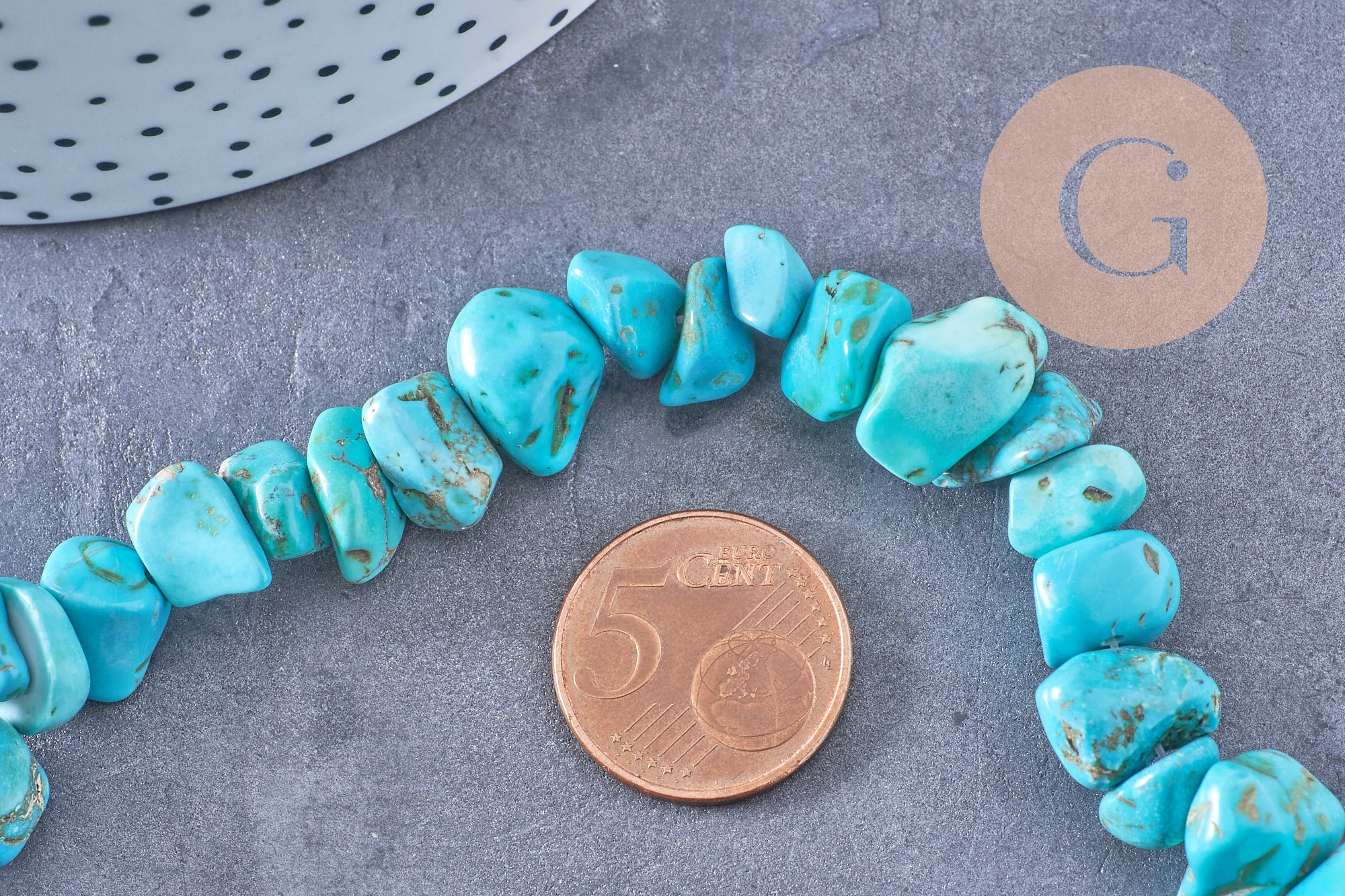 Créez des bijoux bohèmes et naturels avec ce fil de perles chips en turquoise de synthèse. Chaque perle irrégulière apporte texture et authenticité à vos créations DIY. Une alternative accessible à la turquoise naturelle, tout en gardant son charme minéral.