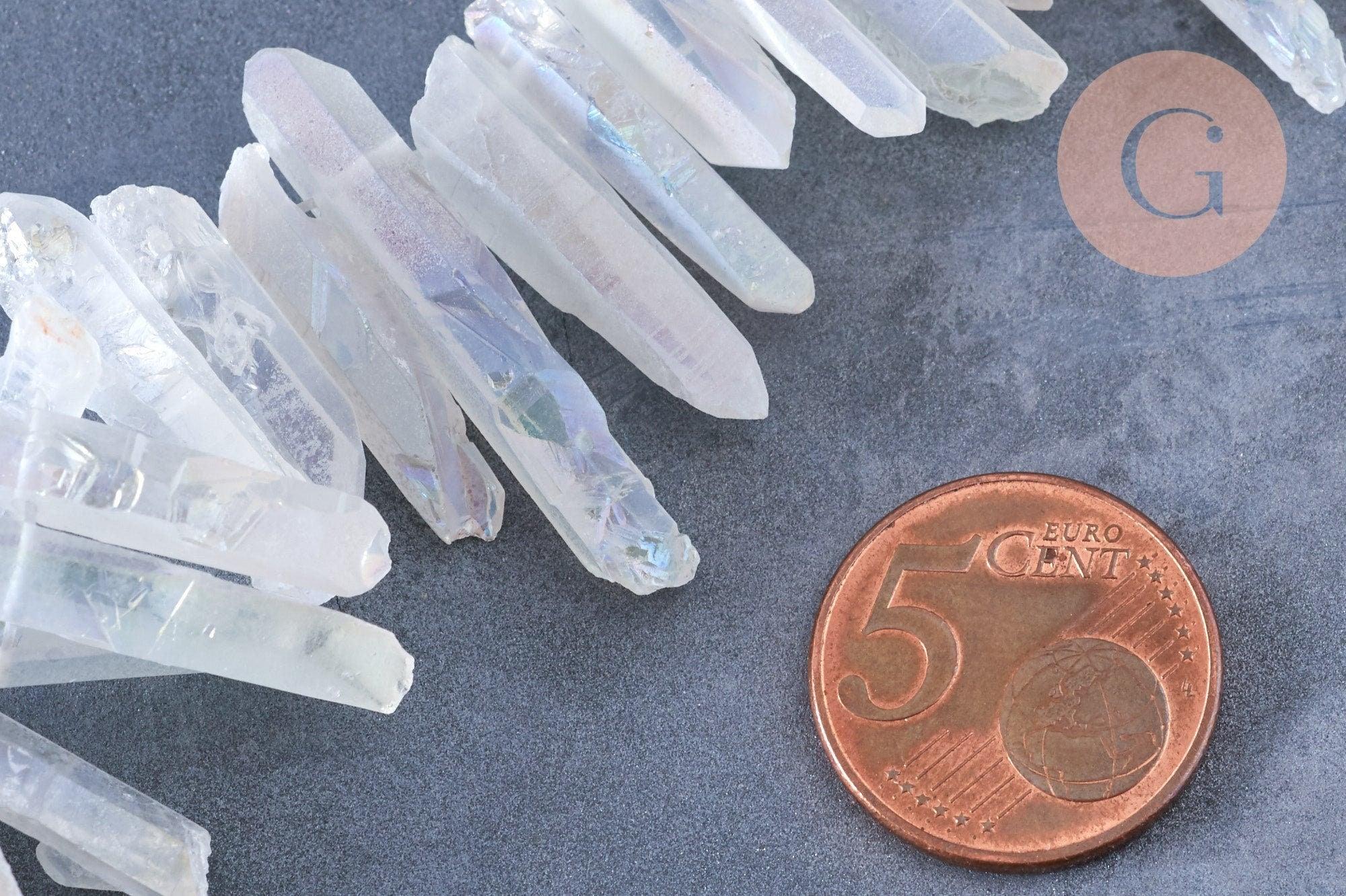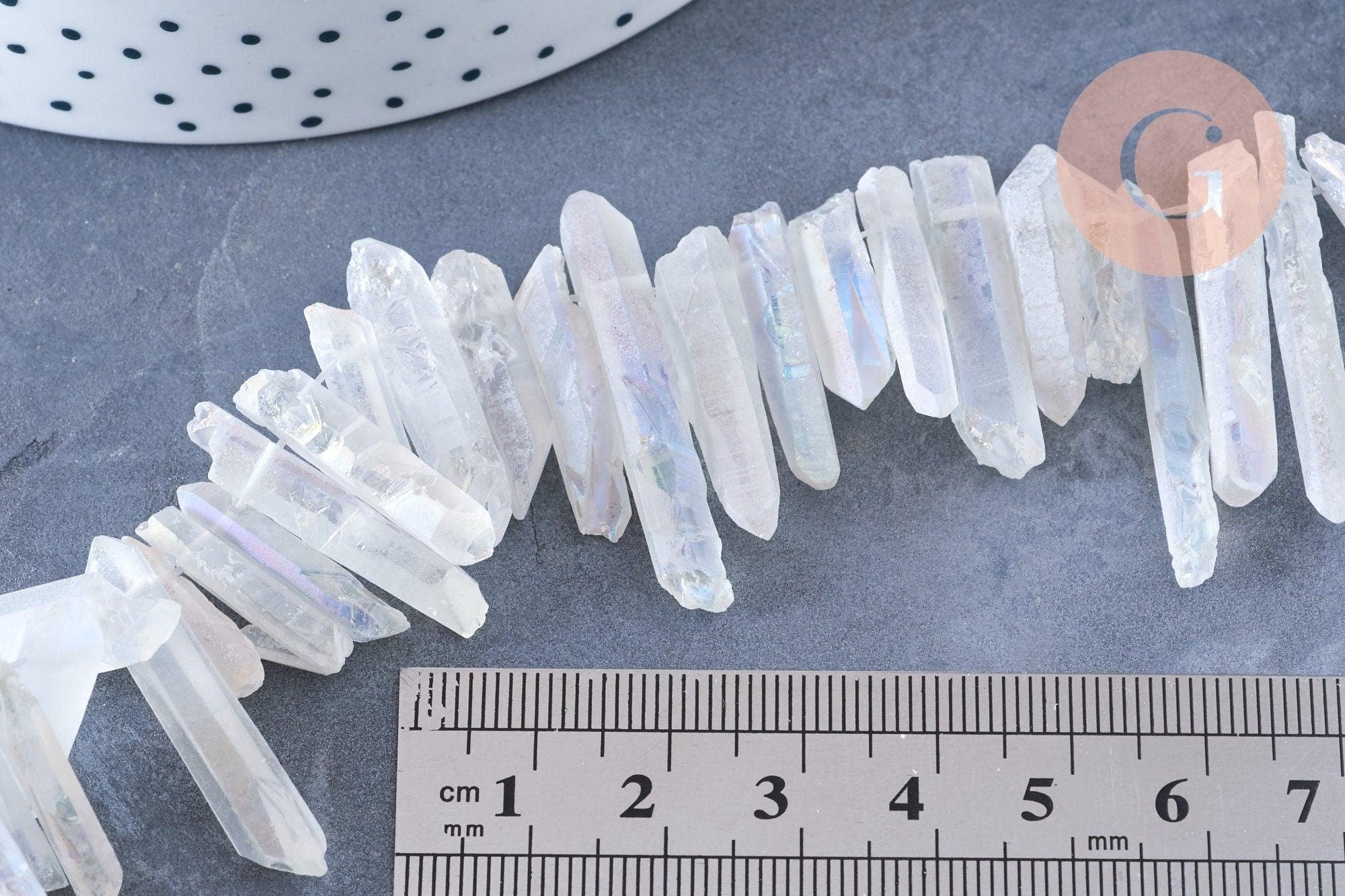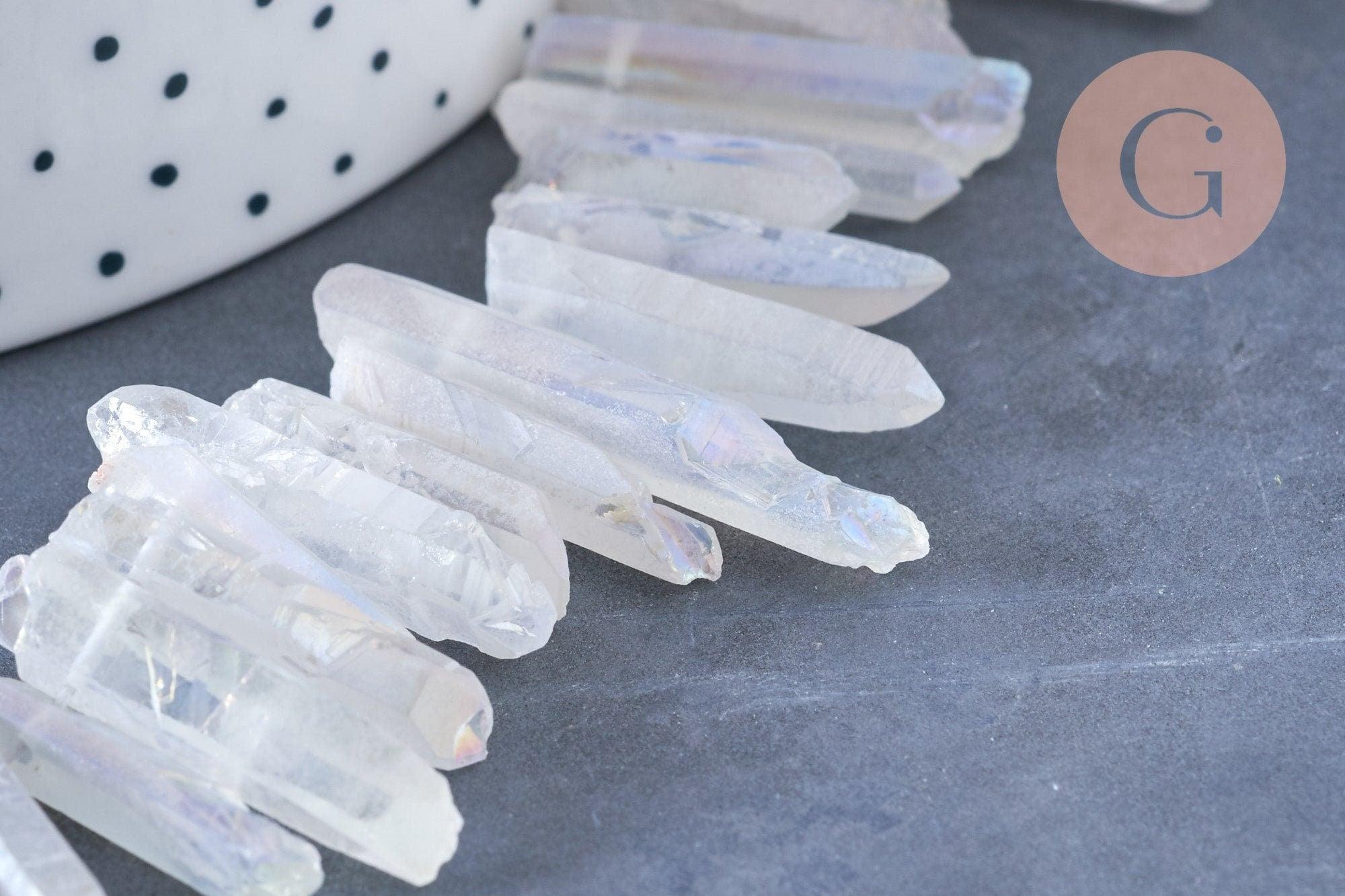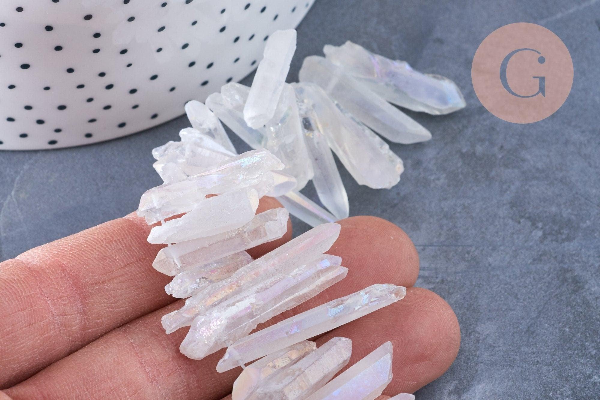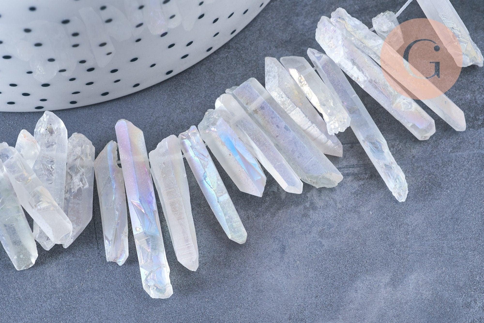 Craquez pour ces perles en cristal de roche irisé brut, plutôt transparentes.