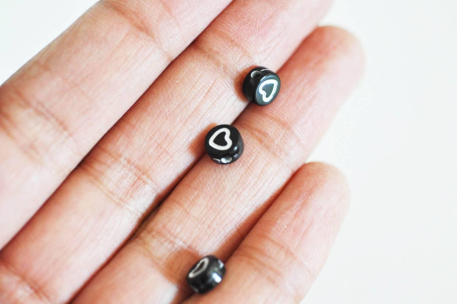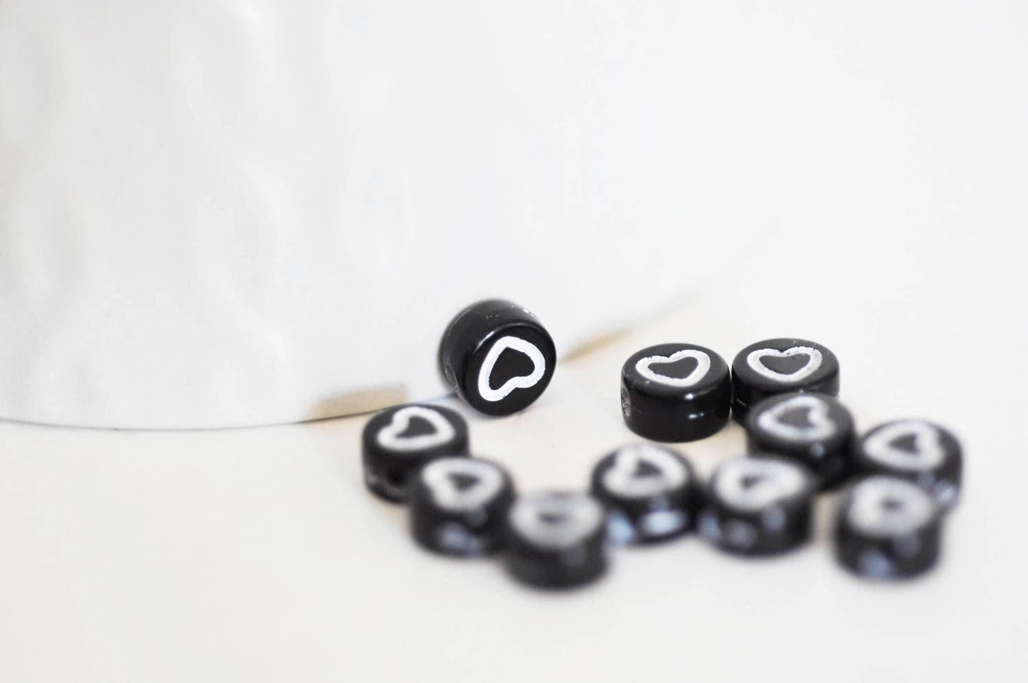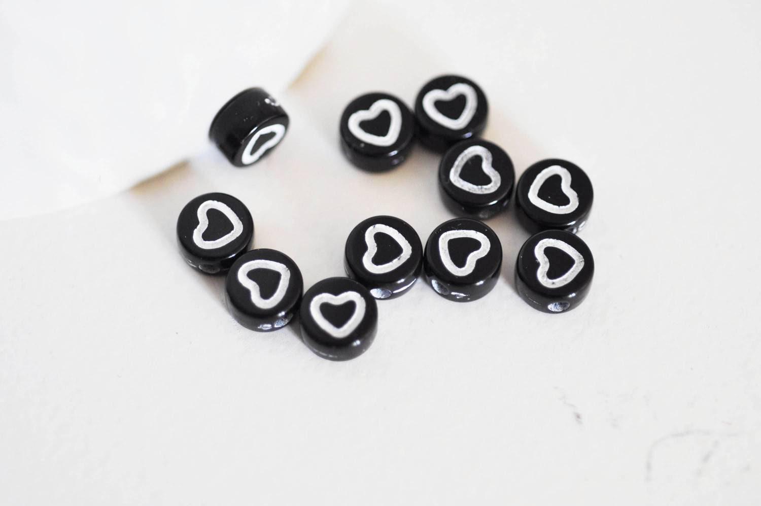 perle ronde coeur blanc plastique noir,perle plastique,perle ronde lettre,création bijoux, lot de 10 grammes