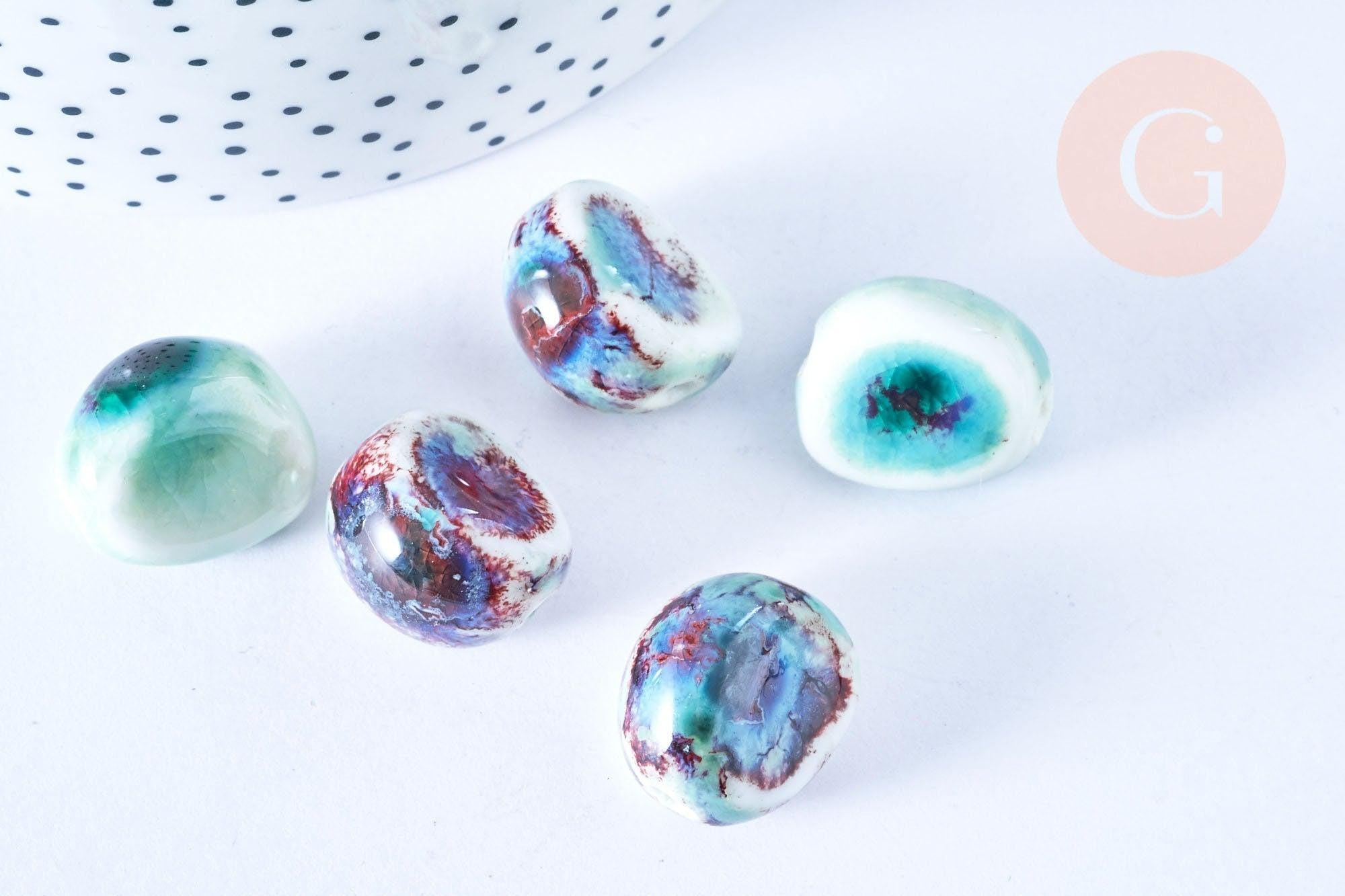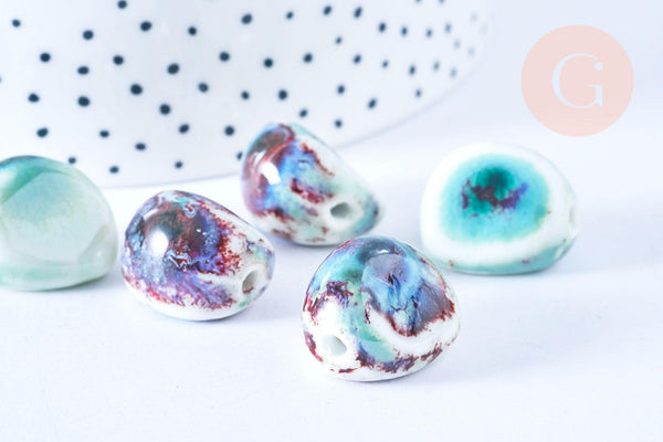 Perle ovale en porcelaine artisanale vert-violet, fantaisie porcelaine émaillée,18-21mm, x5 G5466