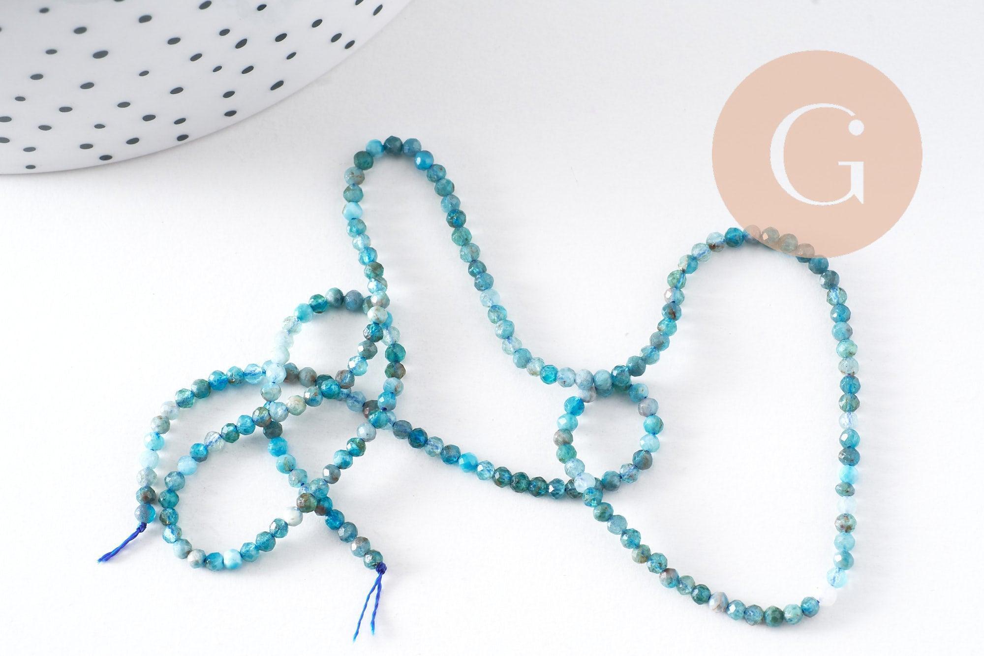 Offrez une touche d’élégance minérale à vos créations avec ce fil de perles en apatite naturelle facettée. Ces perles rondes de 2 mm révèlent de magnifiques reflets bleus et une brillance subtile, idéale pour les bijoux délicats, fins et raffinés.