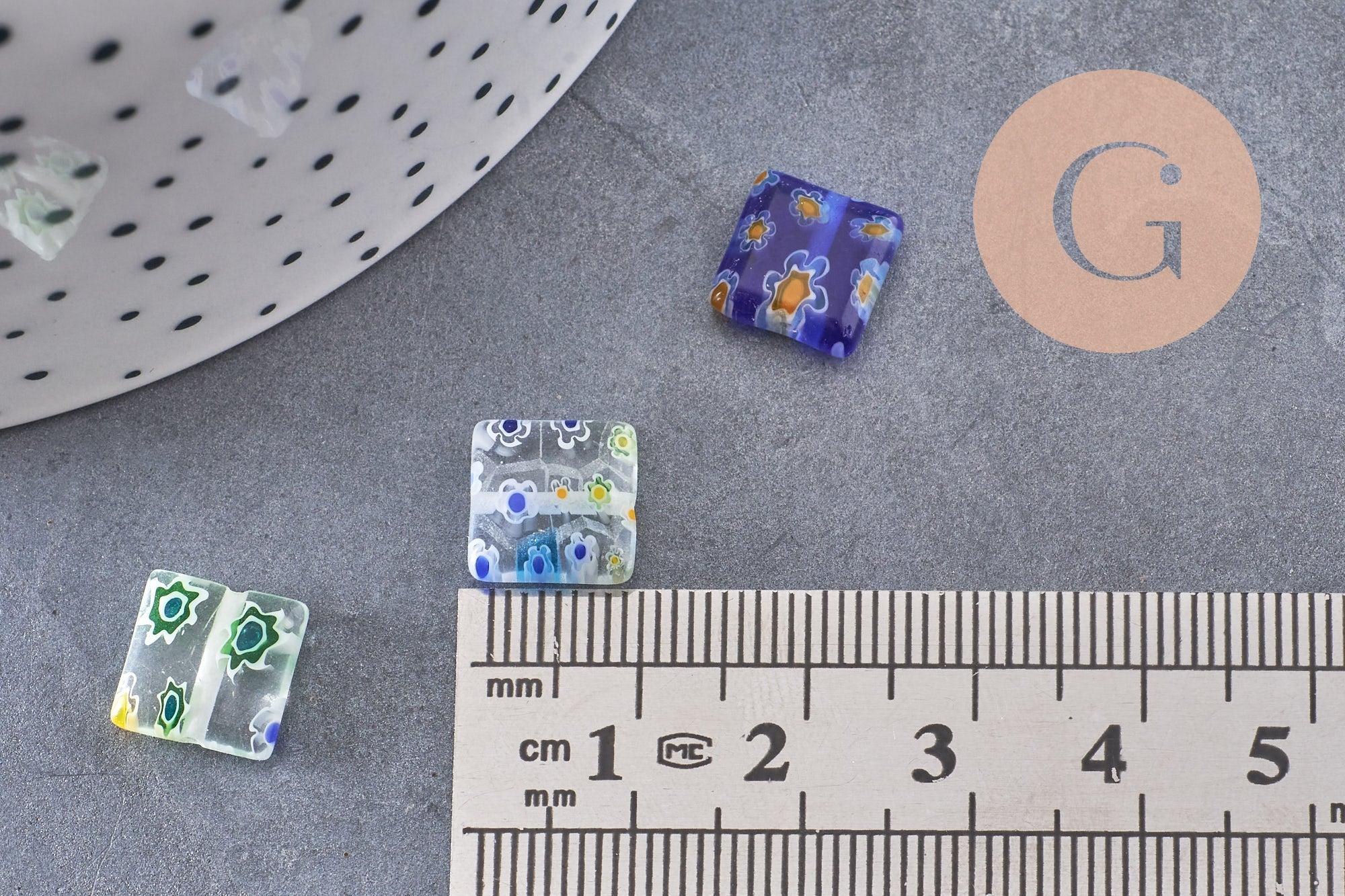 Perle carrée verre millefiori, perle verre,verre artisanal, perle bijou été,création bijoux 10mm, les 5 perles