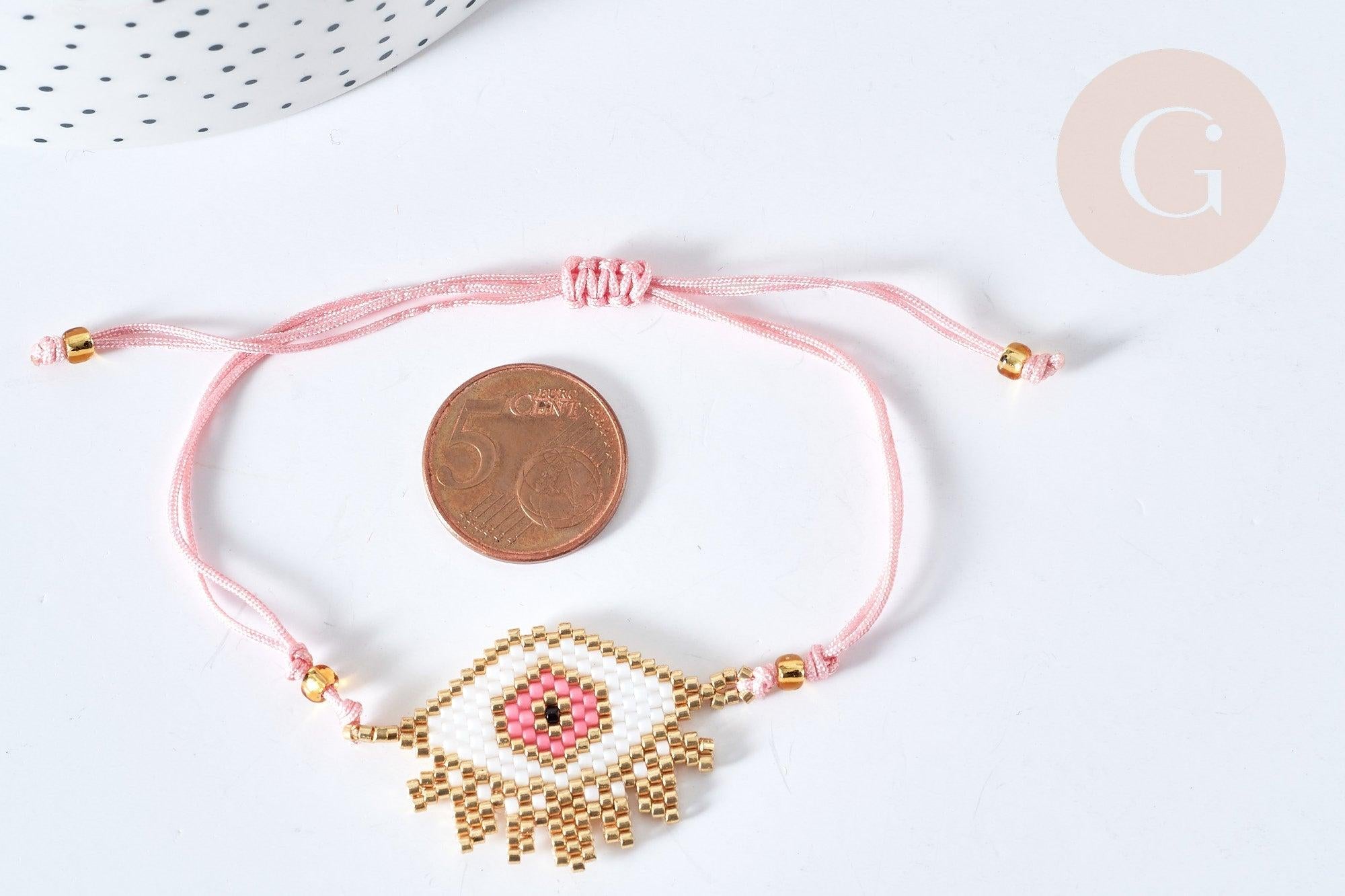 Bracelet Réglable losange mauvais œil rose or 28cm cordon nylon perles rocailles tissées , x1 (G7691)