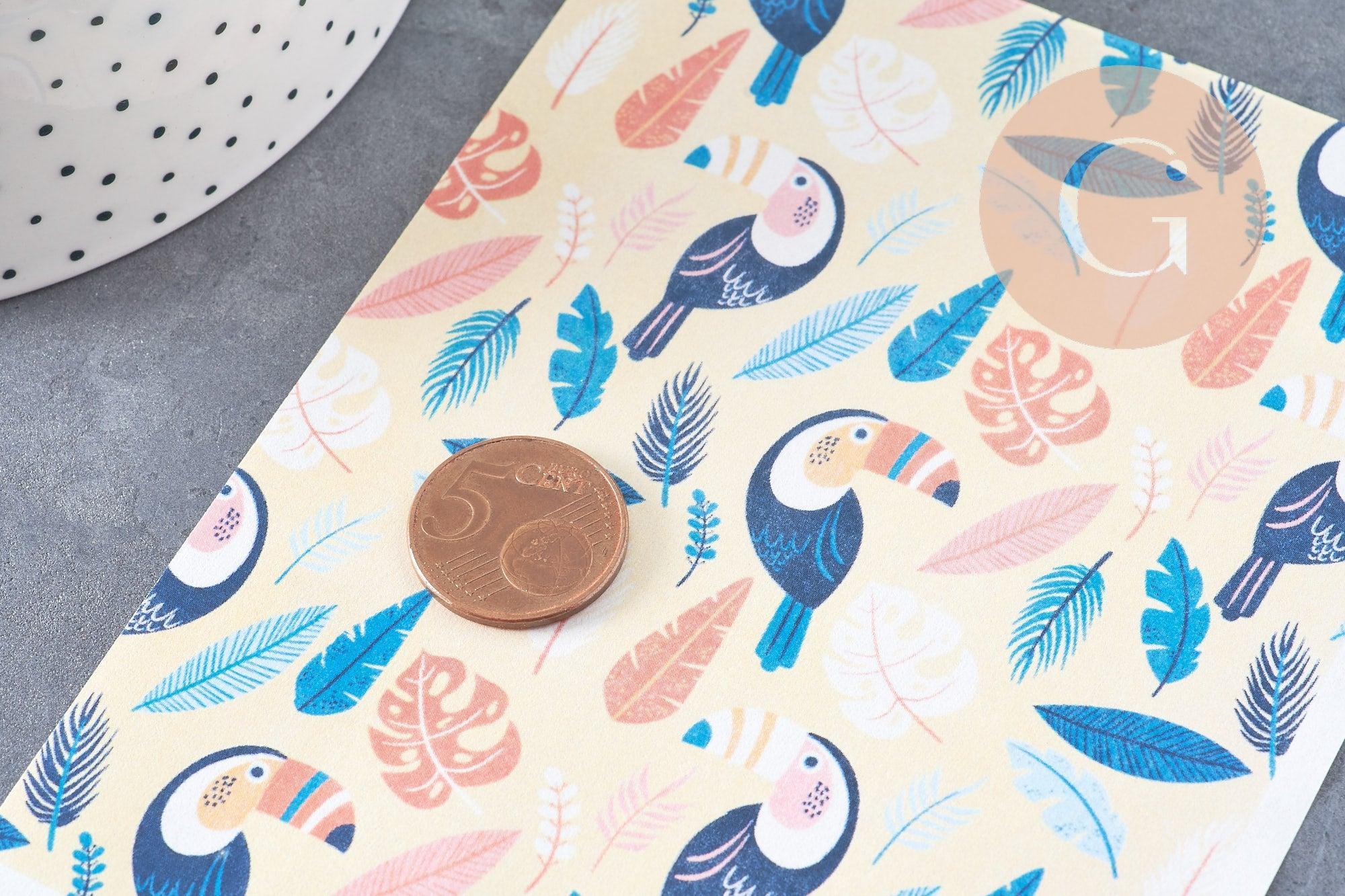 Apportez une touche exotique et colorée à vos créations avec cette feuille de transfert pour pâte polymère. Son motif de toucans sur fond jaune avec des feuilles tropicales apporte éclat et originalité, parfait pour réaliser des bijoux estivaux au style jungle et ensoleillé.