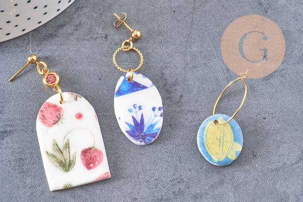 Le transfert adhère mal à la pâte FIMO, en particulier FIMO Soft. Pour de meilleurs résultats, utilisez une pâte claire de type Cernit ou Sculpey Soufflé. Évitez les pâtes colorées ou foncées, qui nuiraient à la lisibilité du motif.