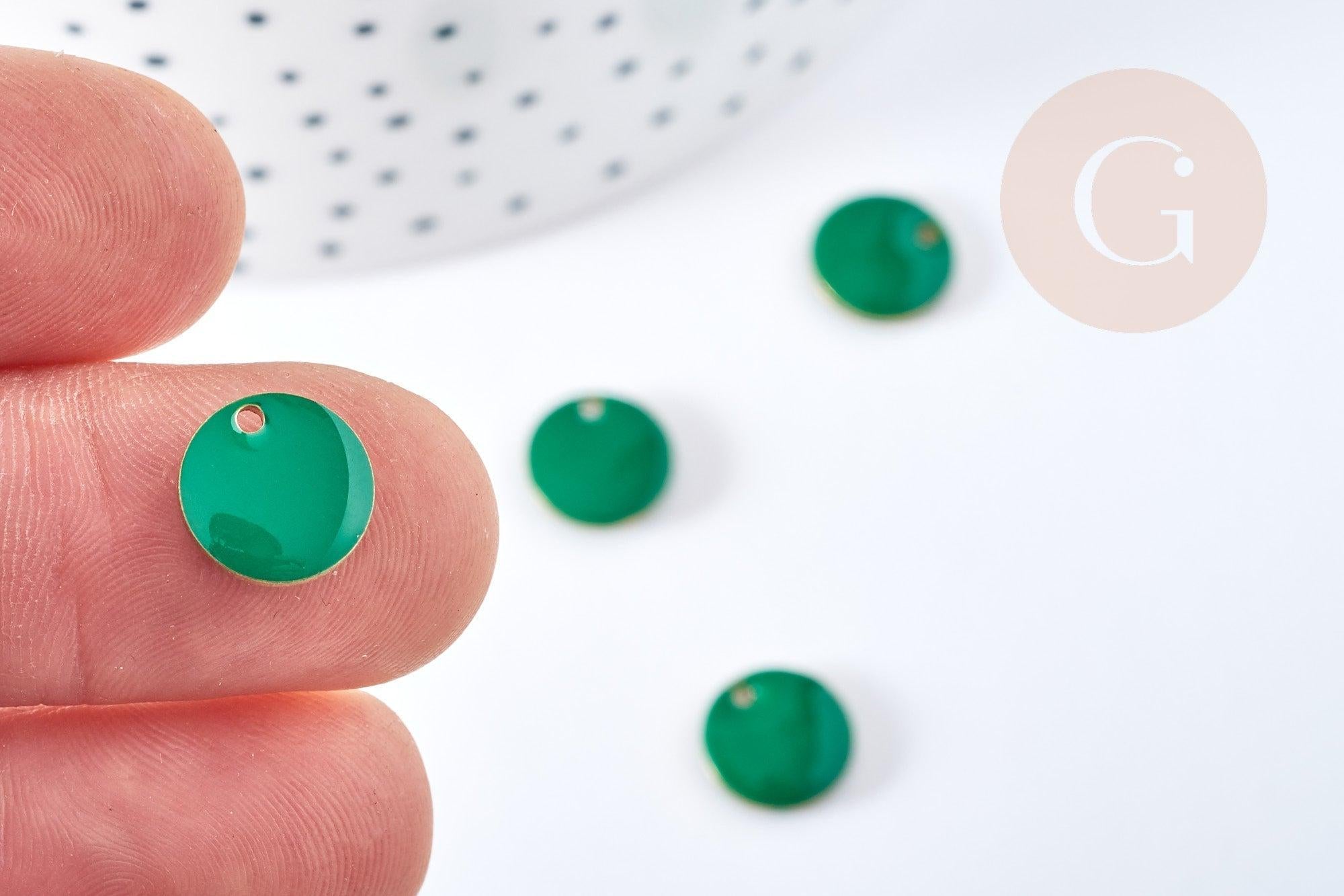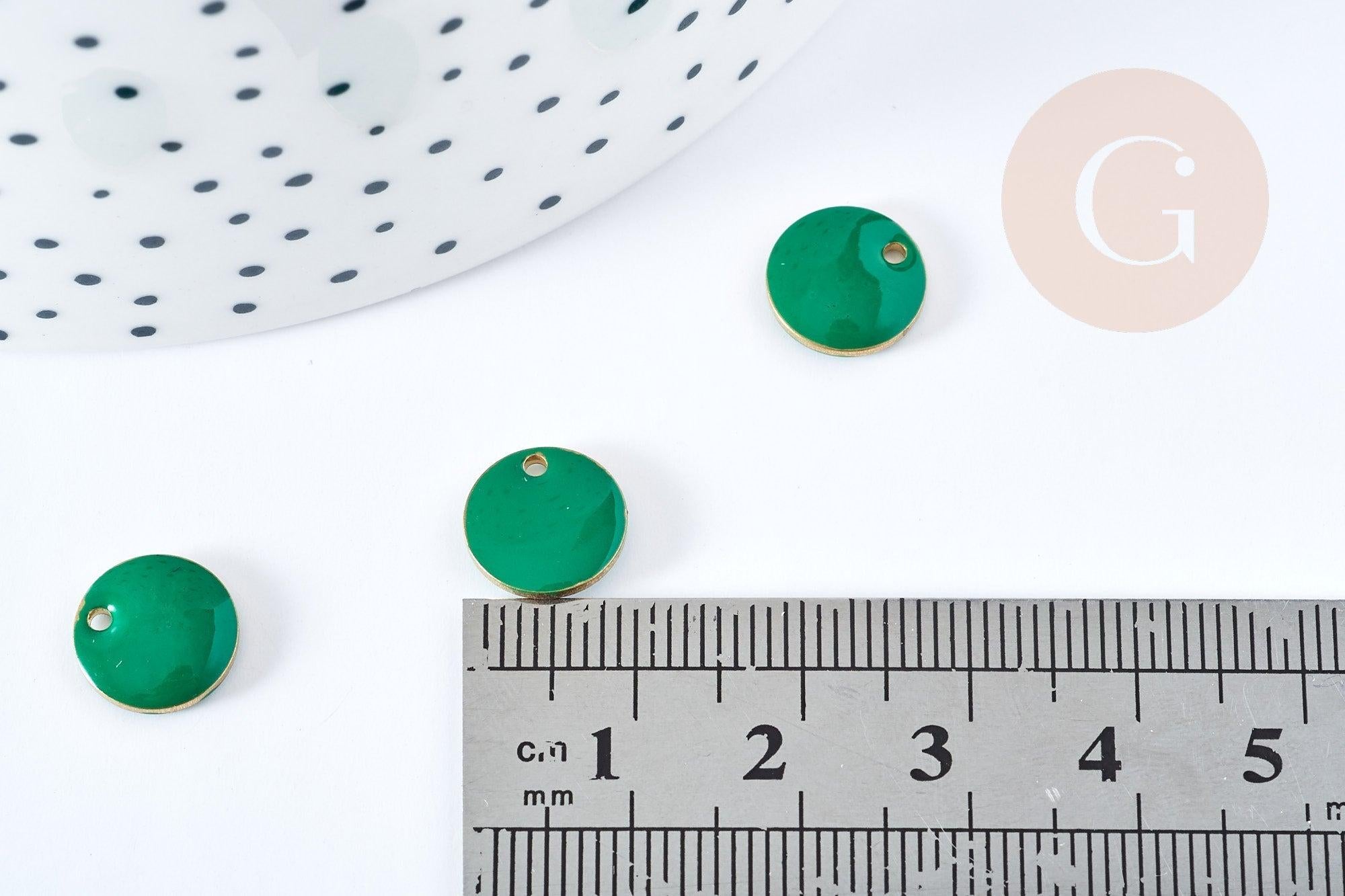 This flat round raw brass charm is coated with durable green enamel on both sides.
