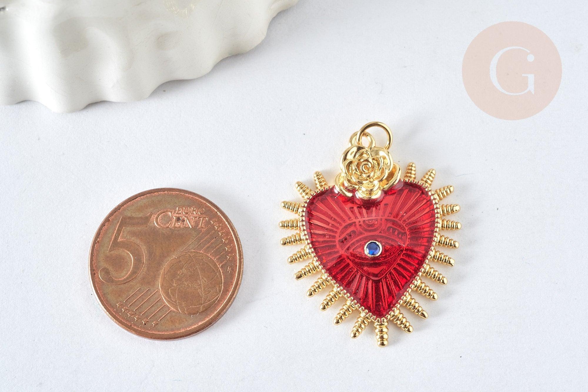 Fall for this golden brass heart pendant which is decorated with an evil eye and a flower on the top of it. It is covered with a dark red enamel.