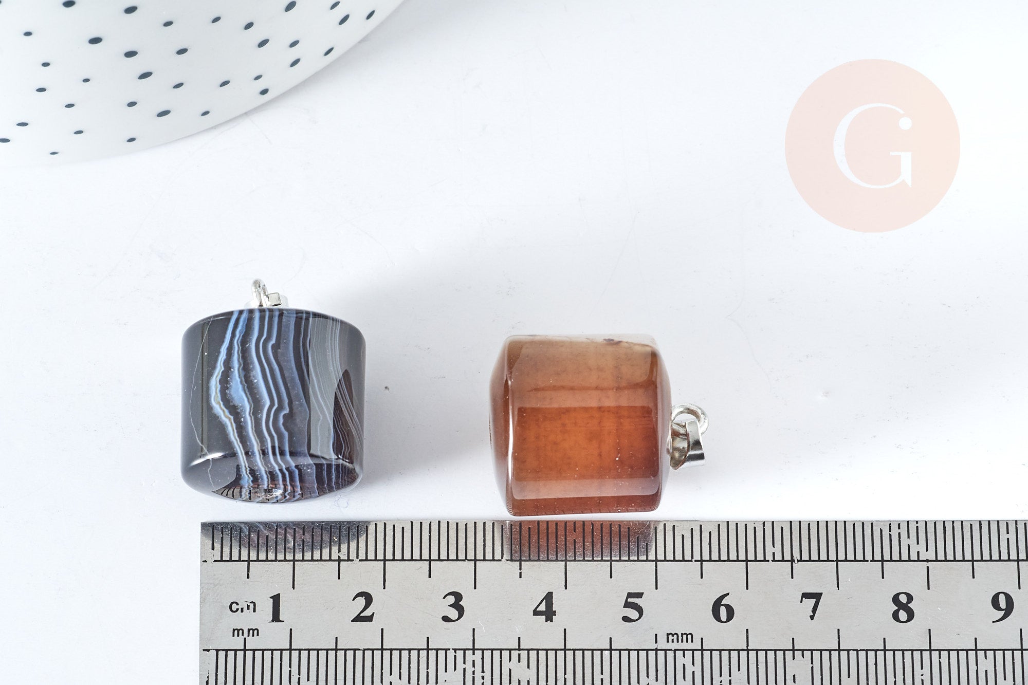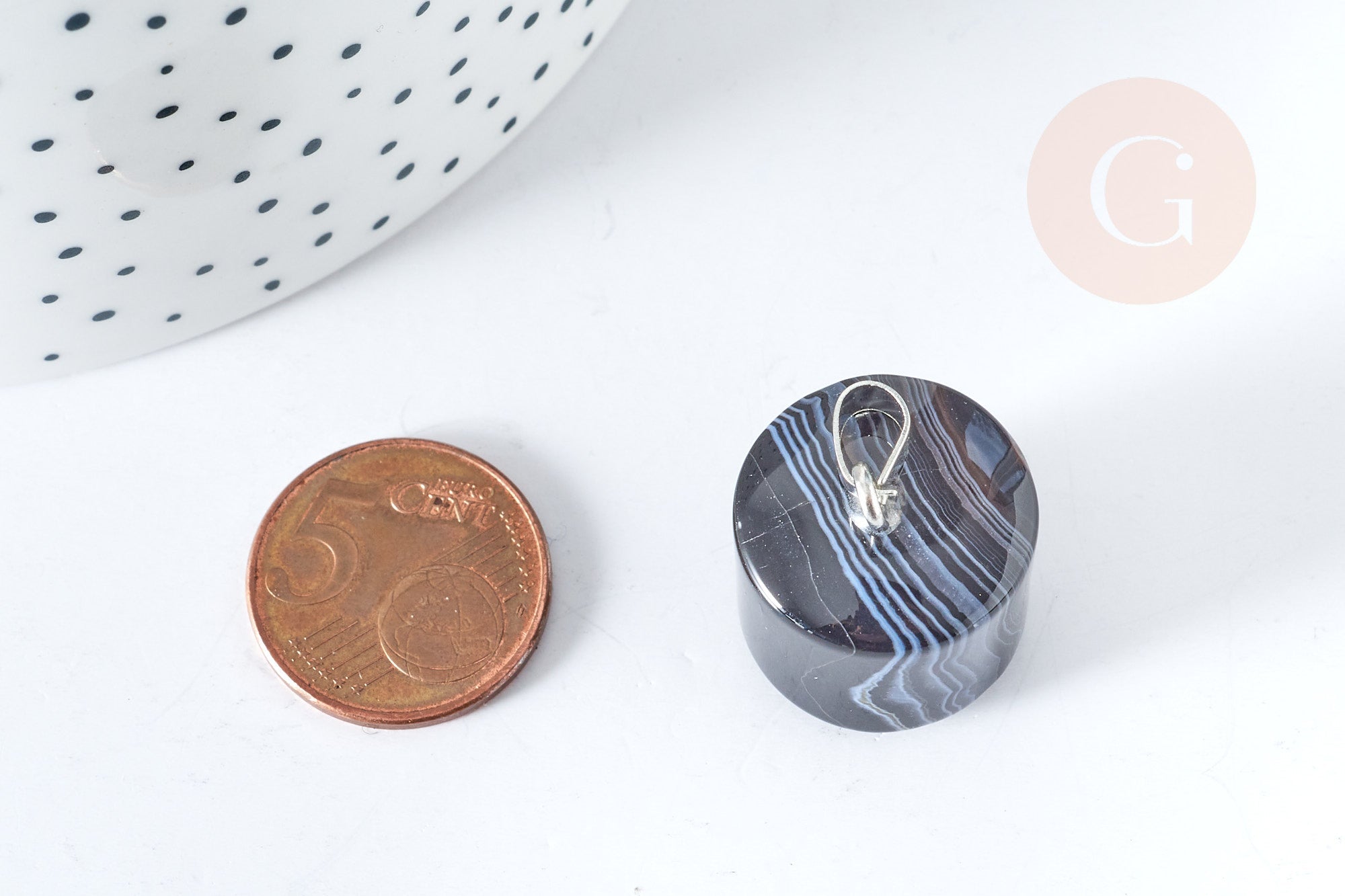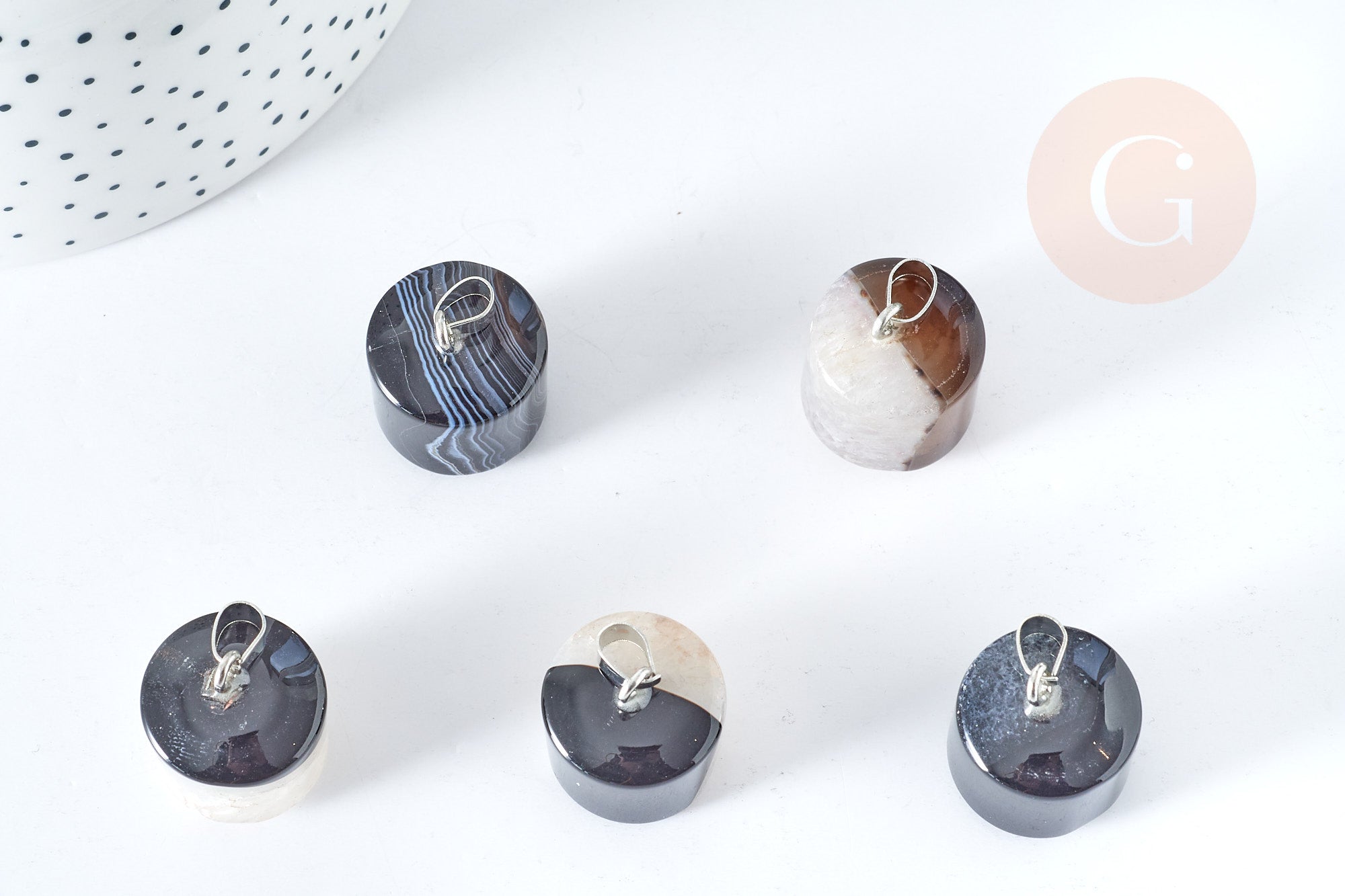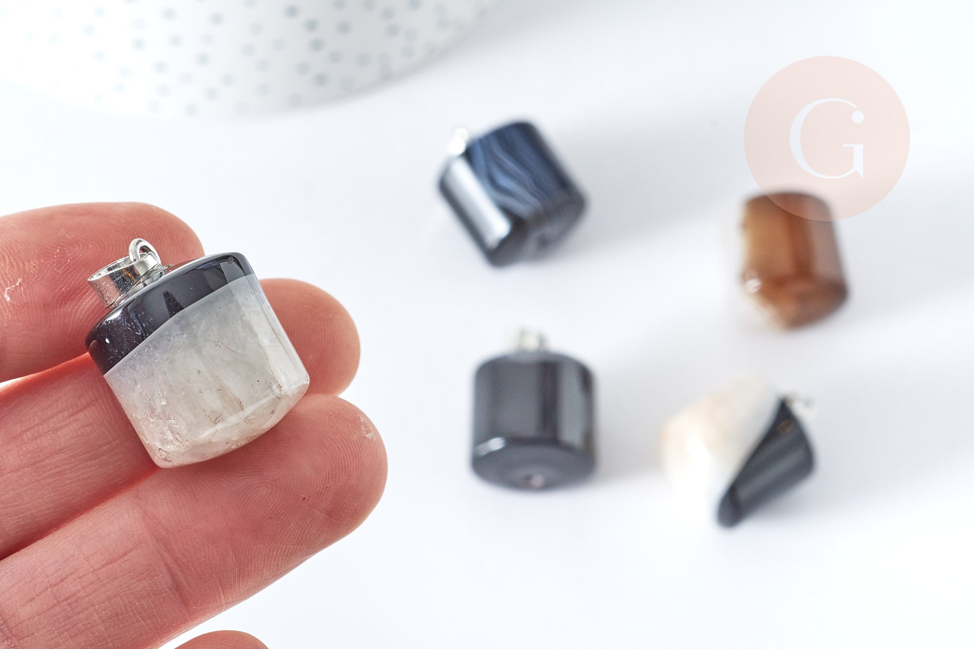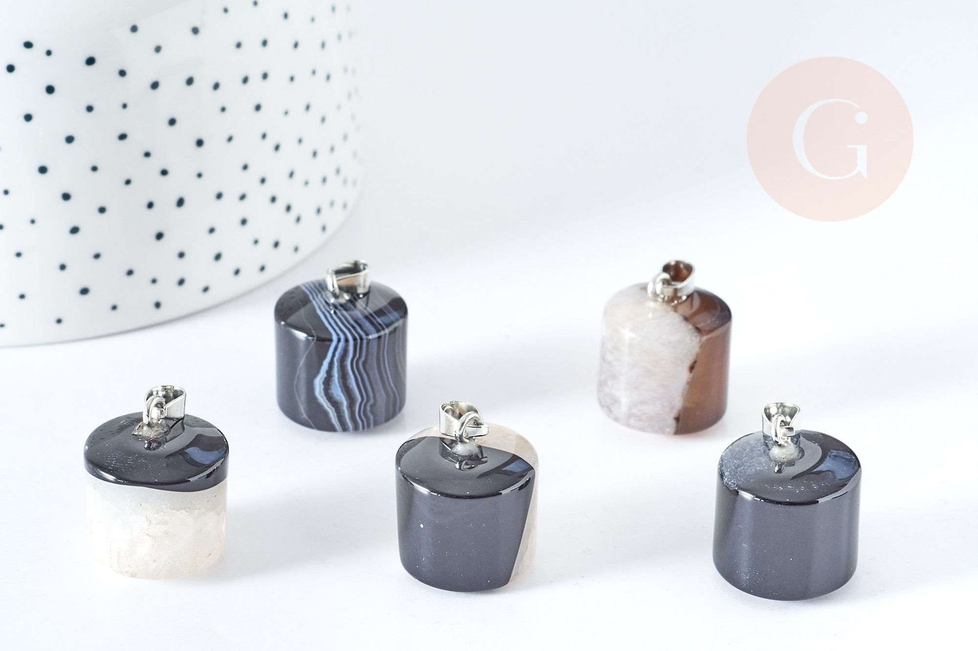 This gray black iron platinum striped agate cylinder pendant is a true wonder of nature. Cut from a quality natural stone , it is one of a kind and is ideal for creating refined and original jewelry.