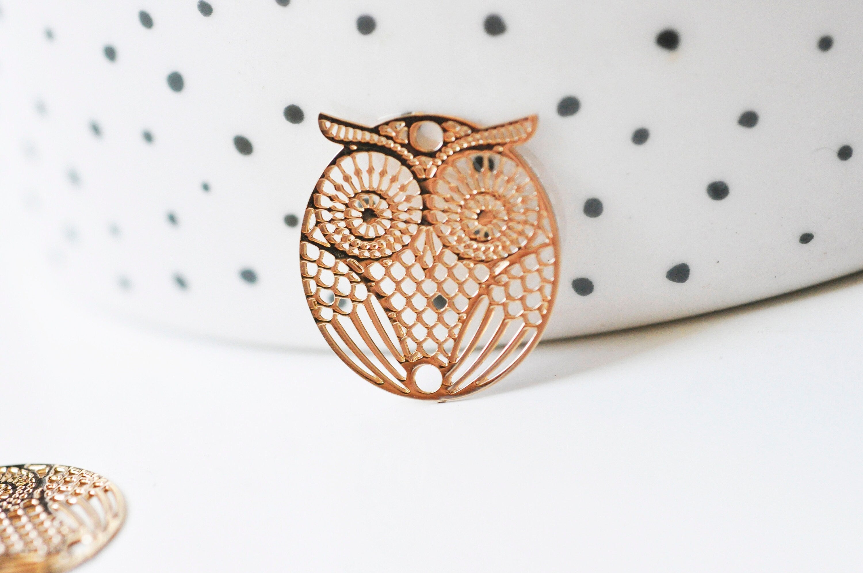 Owl filigree print pendant in rose gold brass, Very fine and light pendant for jewelry creation, 18mm, Set of 2, A set of two very fine prints on a very fine owl motif. A light pendant, ideal for making earrings,...