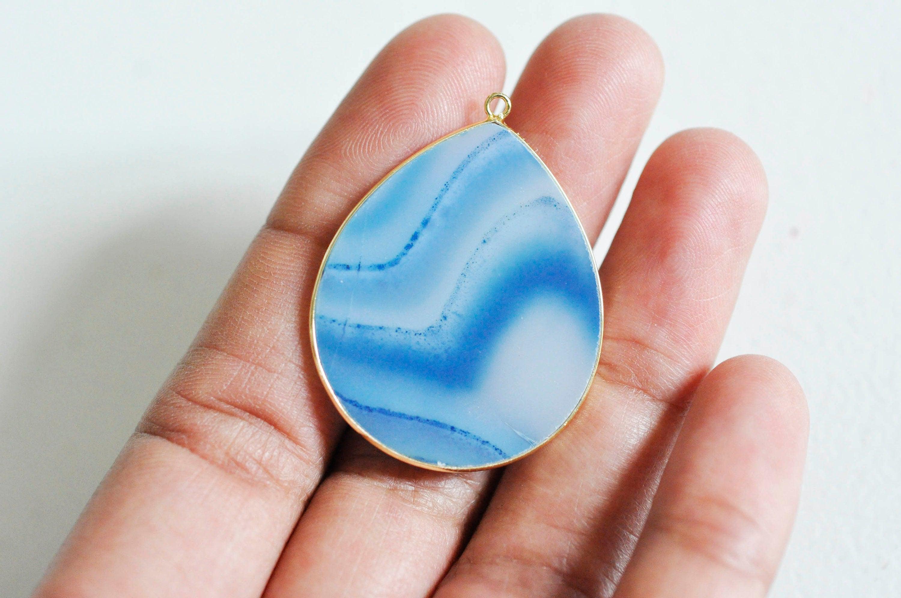 Striped blue agate drop pendant, jewelry pendant, stone pendant, natural stone, natural agate, jewelry creation, 41mm Fall for this drop pendant in natural striped agate, to make very trendy bohemian chic jewelry. Width: 31mm Length 41mm Thickness: 3mm Golden brass...