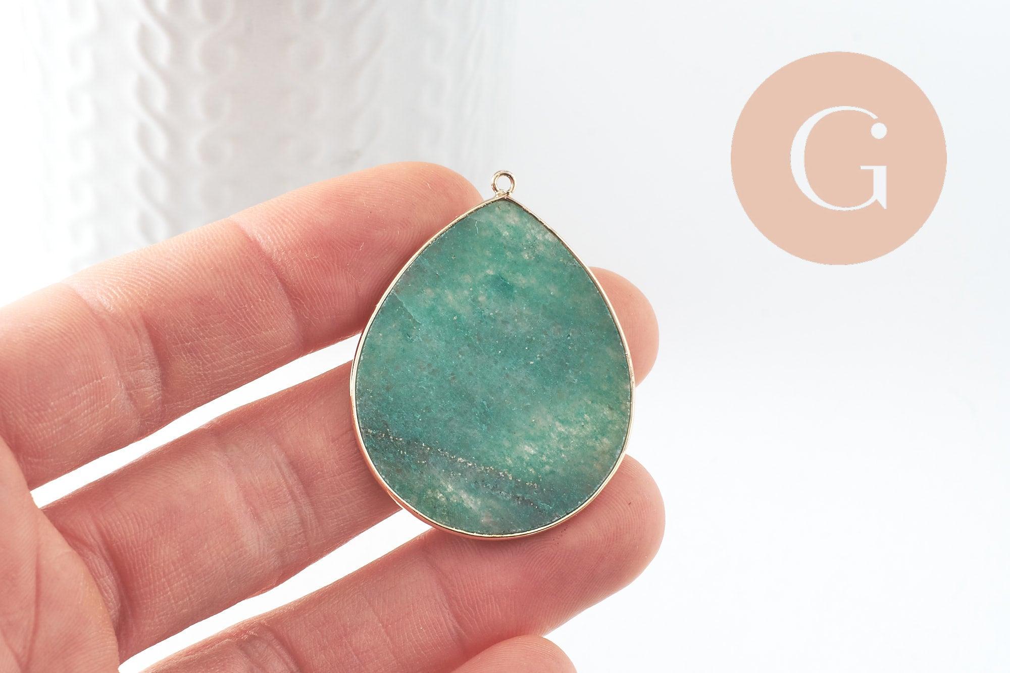 Fall for this large drop-shaped pendant, cut from natural, undyed green aventurine and set in a gold-plated brass frame . With its generous dimensions and smooth finish, it is ideal for creating bohemian chic jewelry or talismans inspired by nature. The stone, in its raw, untreated state, reveals subtle green nuances unique to each piece.