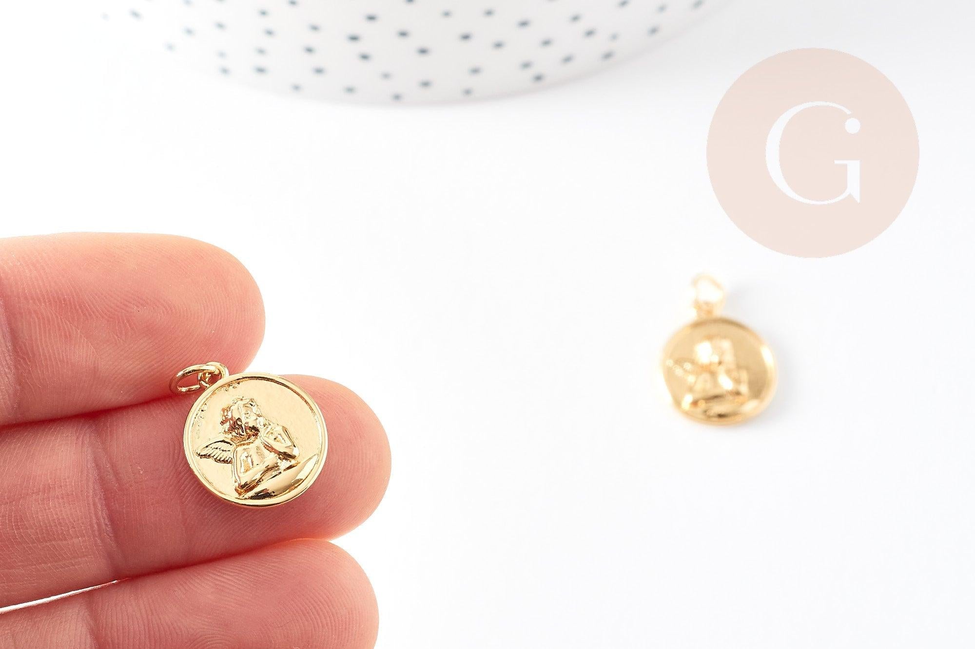 Round angel medal pendant in 18K gold-plated brass, gold-plated brass pendant for jewelry creation, gold medal, 17mm, each