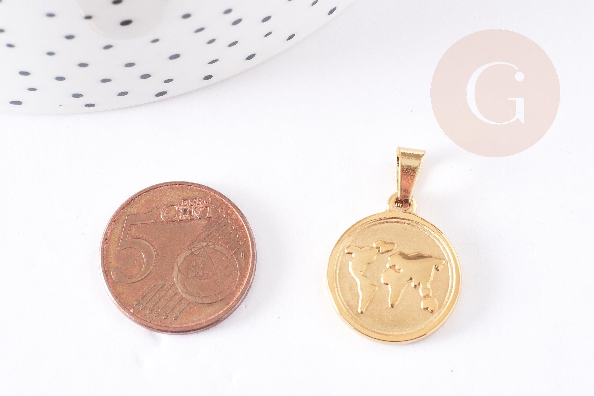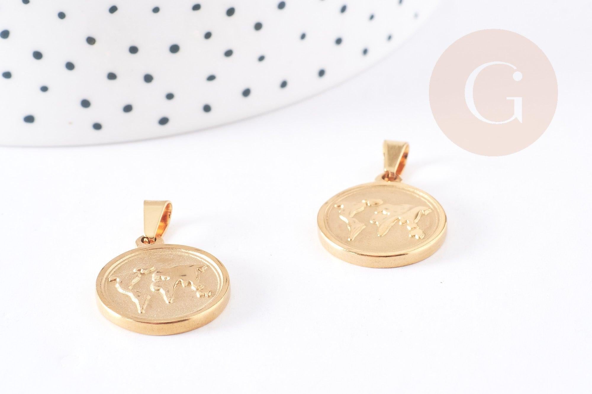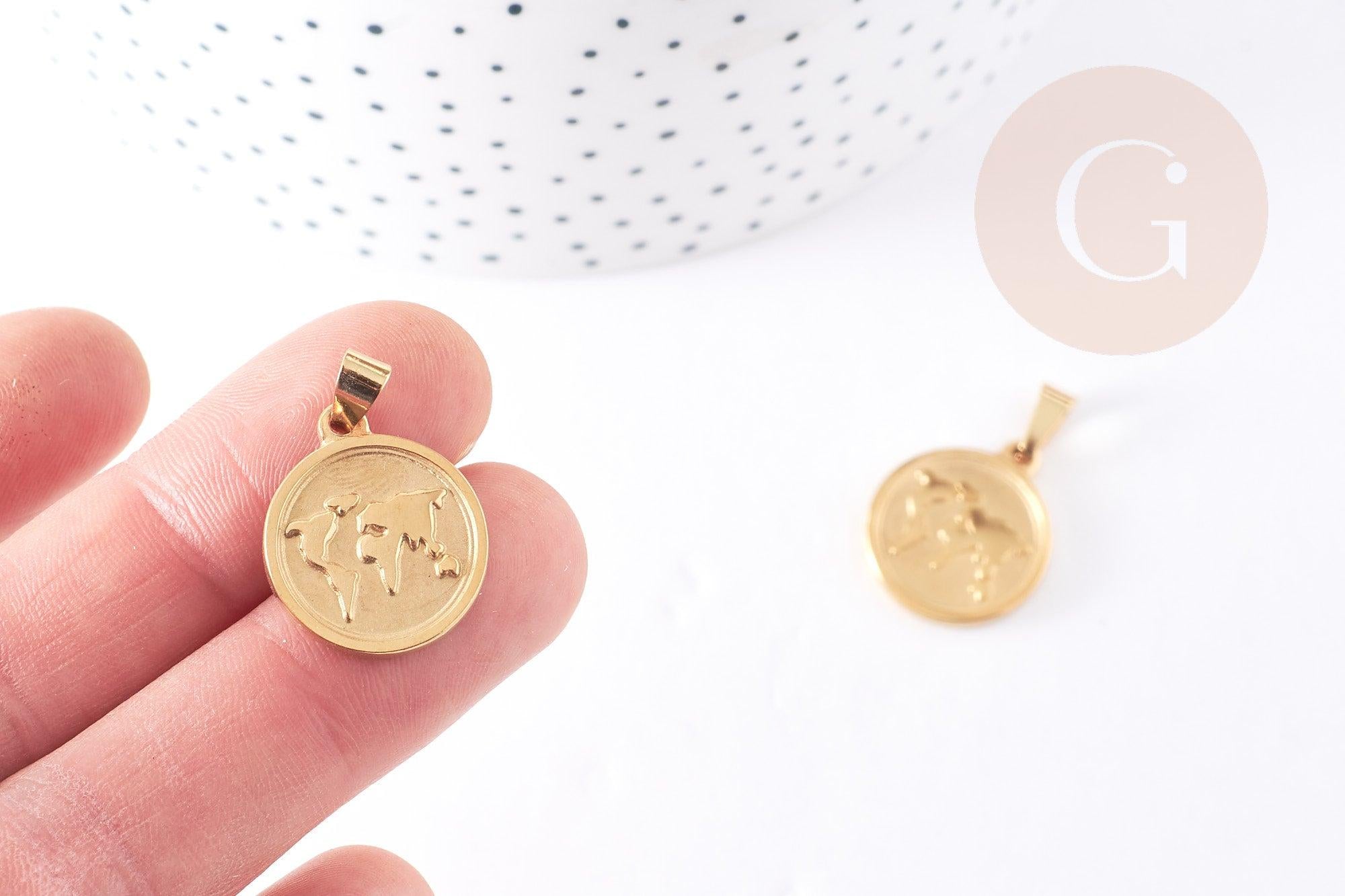 Gold steel world round medal pendant, gold pendant, nickel free, gold steel, jewelry creation, gold medal, 2.1cm