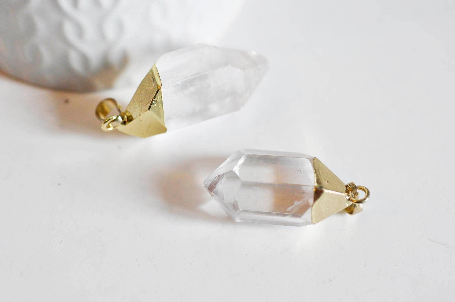 Golden transparent crystal point pendant, creative supplies, jewelry pendant, stone pendant, natural crystal, crystal pendant Fall for this transparent crystal pendant with its golden support. You can create magnificent necklaces using this very trendy pendant. The stone is cut into...