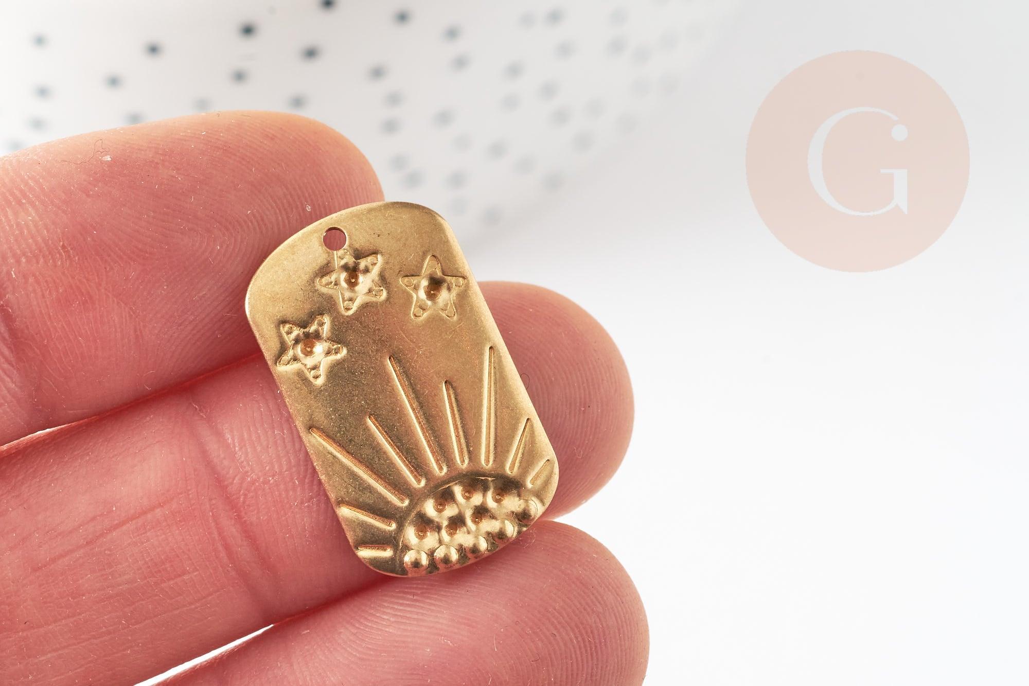 Add a celestial touch to your jewelry creations with our rectangle pendant, representing the sun and stars, in raw brass.