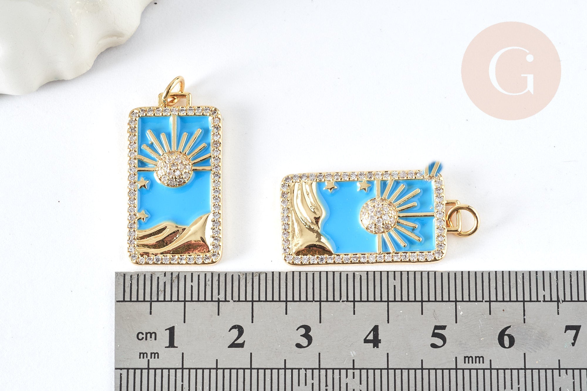Fall for this rectangular pendant in golden brass which is decorated with a sun, two stars and a mountain. It is covered with a blue enamel for the sky and all around the pendant, it is decorated with white round zircons .